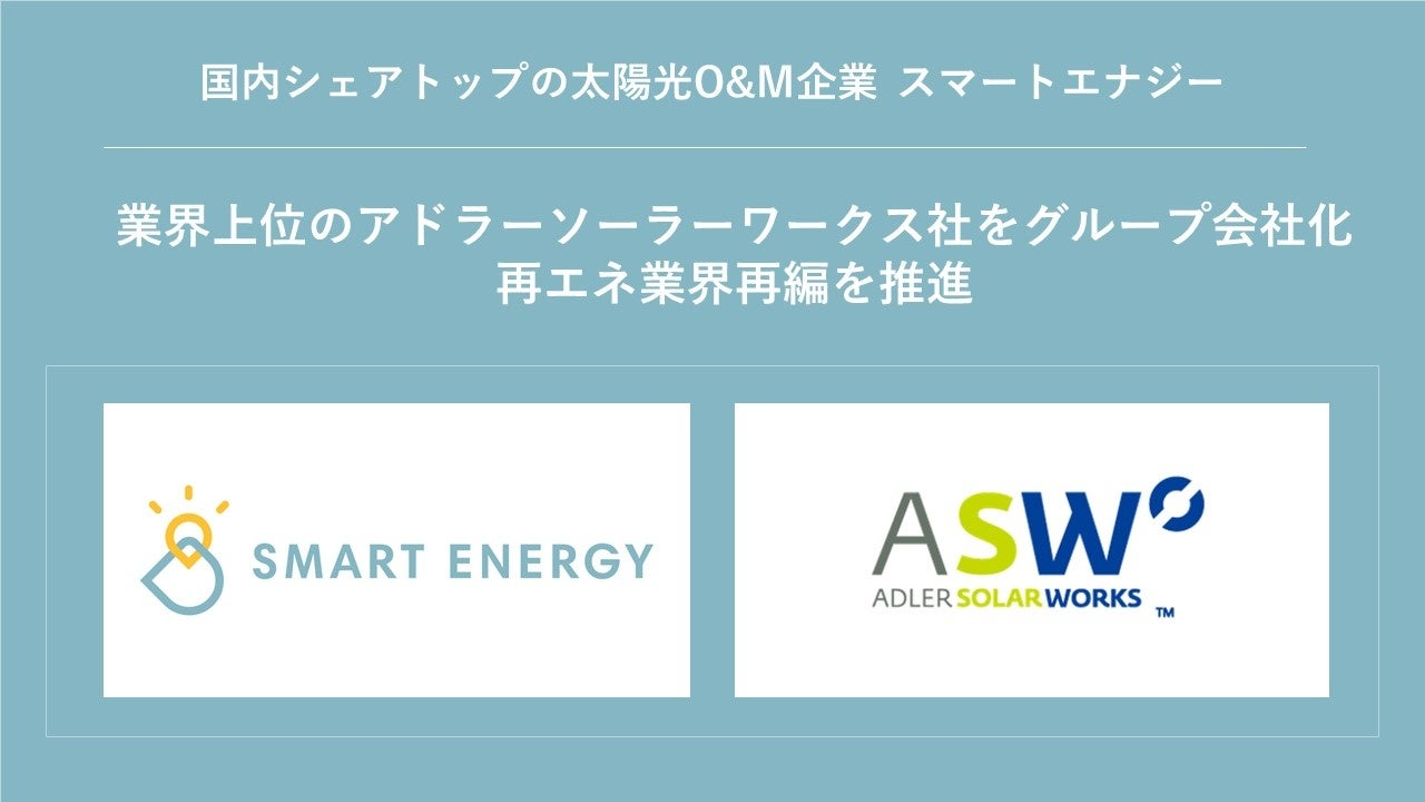 【太陽光発電の運用・保守(O&M)サービス国内最大手のスマートエナジー社、業界上位のアドラーソーラーワークス社をグループ会社化】FIT終了による売電価格低下を見据え、再エネ業界再編を推進