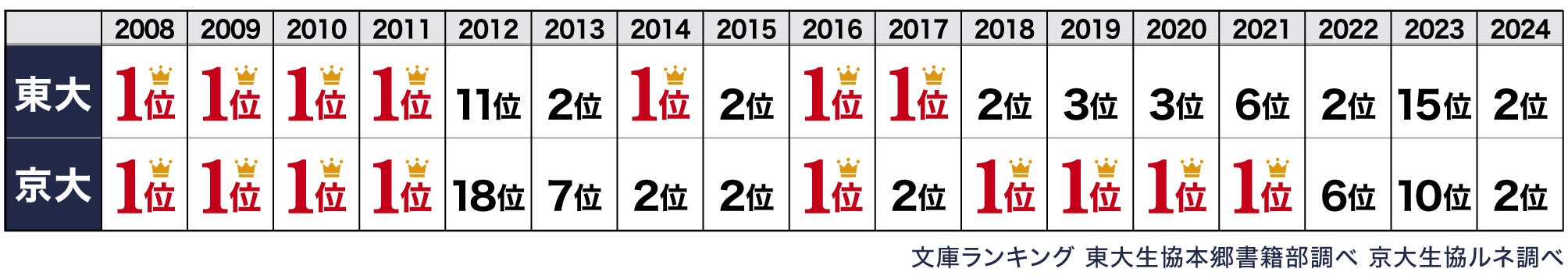 『思考の整理学』は歴代の東大生・京大生に根強く支持されてきました。年間文庫ランキング1位を初めて獲得した2008年から2024年までの17年間で東大生協本郷書籍部では7度、京大生協では9度も1位となっています。