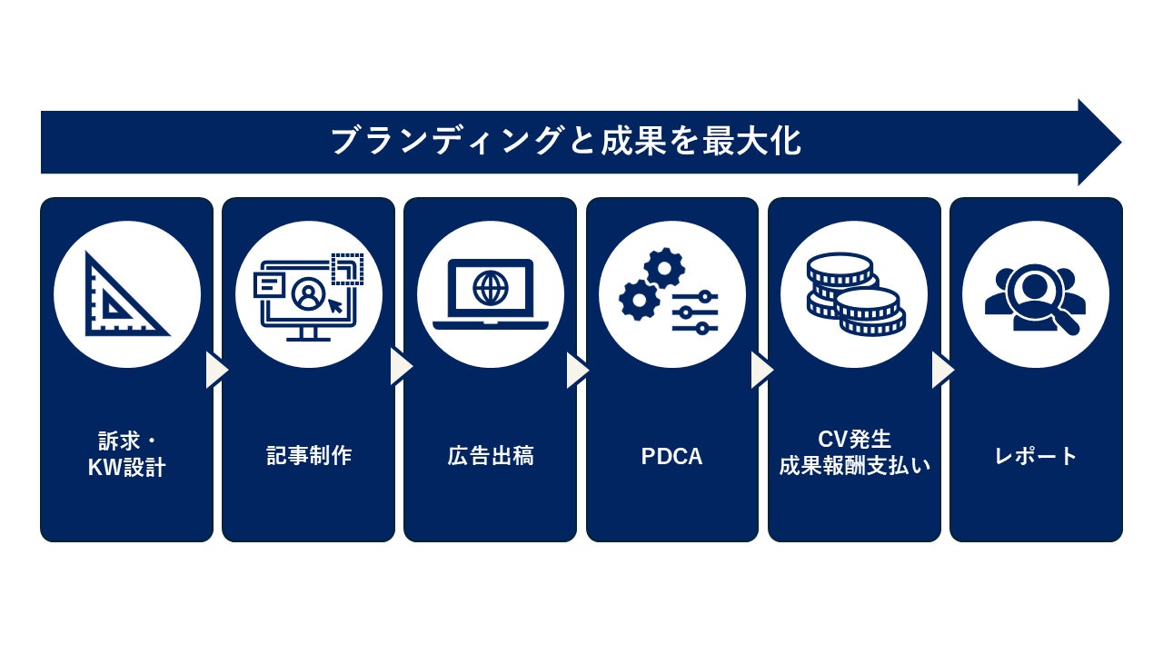 本サービスは、これまでSEOを中心に成果を上げてきた広告主を対象に、リスティング広告による集客を行うアフィリエイト記事の新規制作を支援するもので、訴求設計からサイト構築、運用コンサルティングまでを一気通貫で支援します。広告主が自社ブランドの世界観を維持しながら、低リスクで持続的な成果報酬型での獲得基盤を構築することを可能にします。