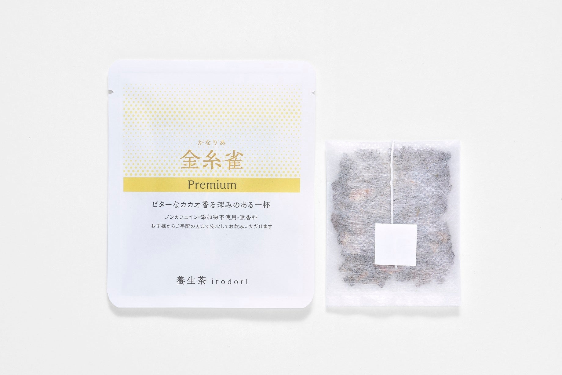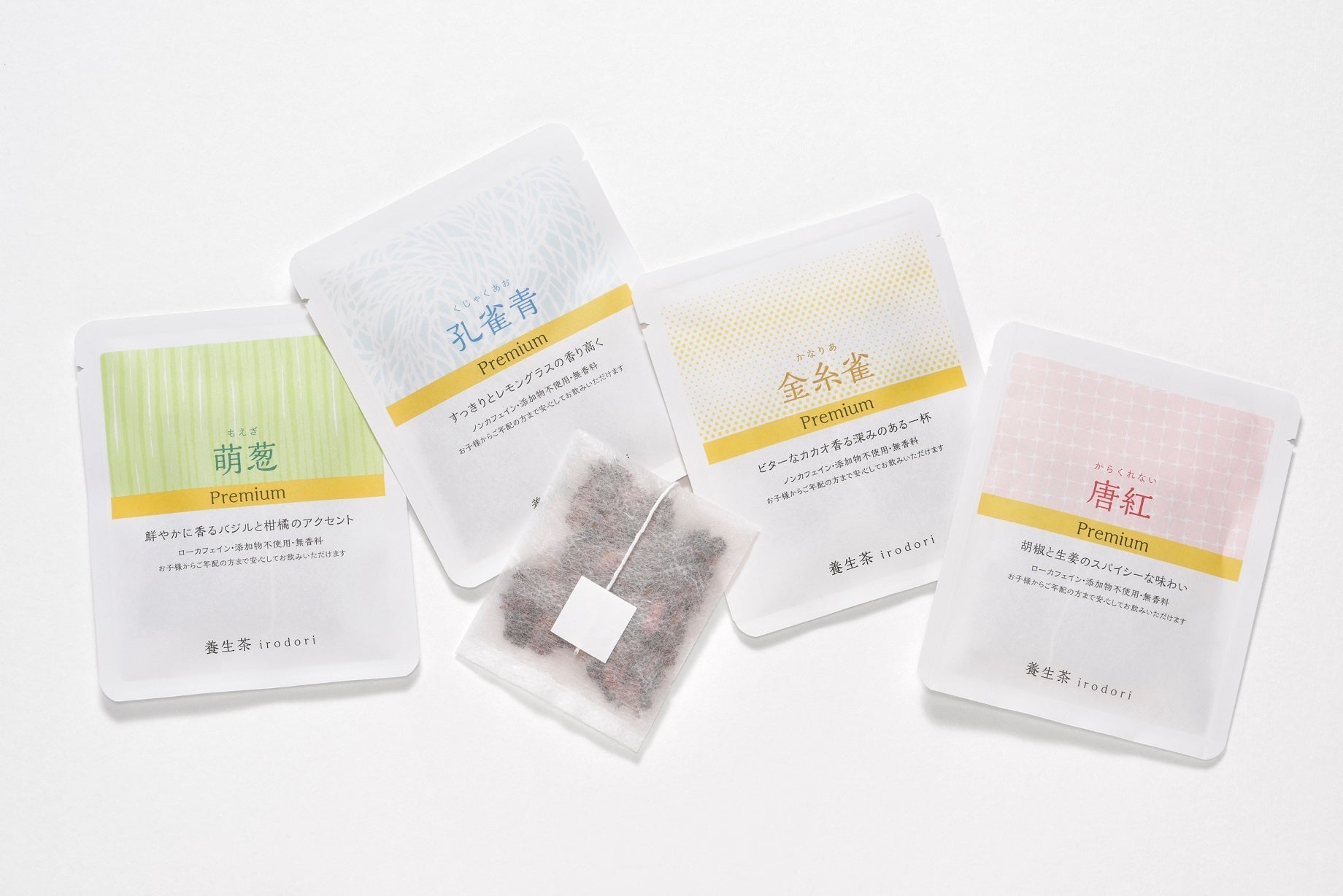 商品名 養生茶irodori 「萌葱Premium」「金糸雀Premium」 ※1包ずつの個別包装、ティーバッグ式