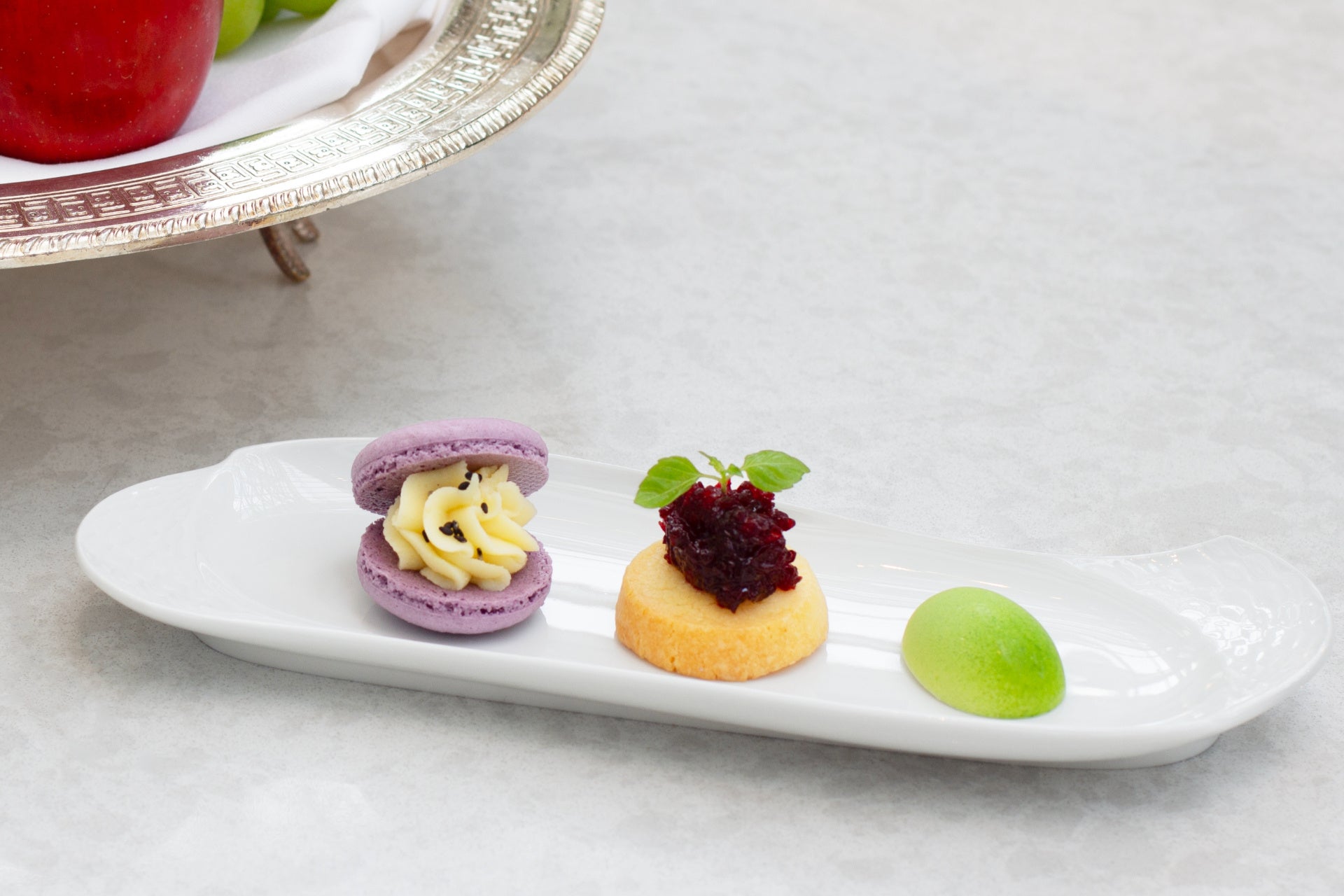 今回のシグネチャープレートは「魔法にかけられたプリンセス」がテーマ。煌めくダイヤモンドのようにカットされた「晴王」や、コンポートした林檎を丁寧に束ねた深紅の薔薇など、パティシエの魔法のような技術でお仕立ていたします。