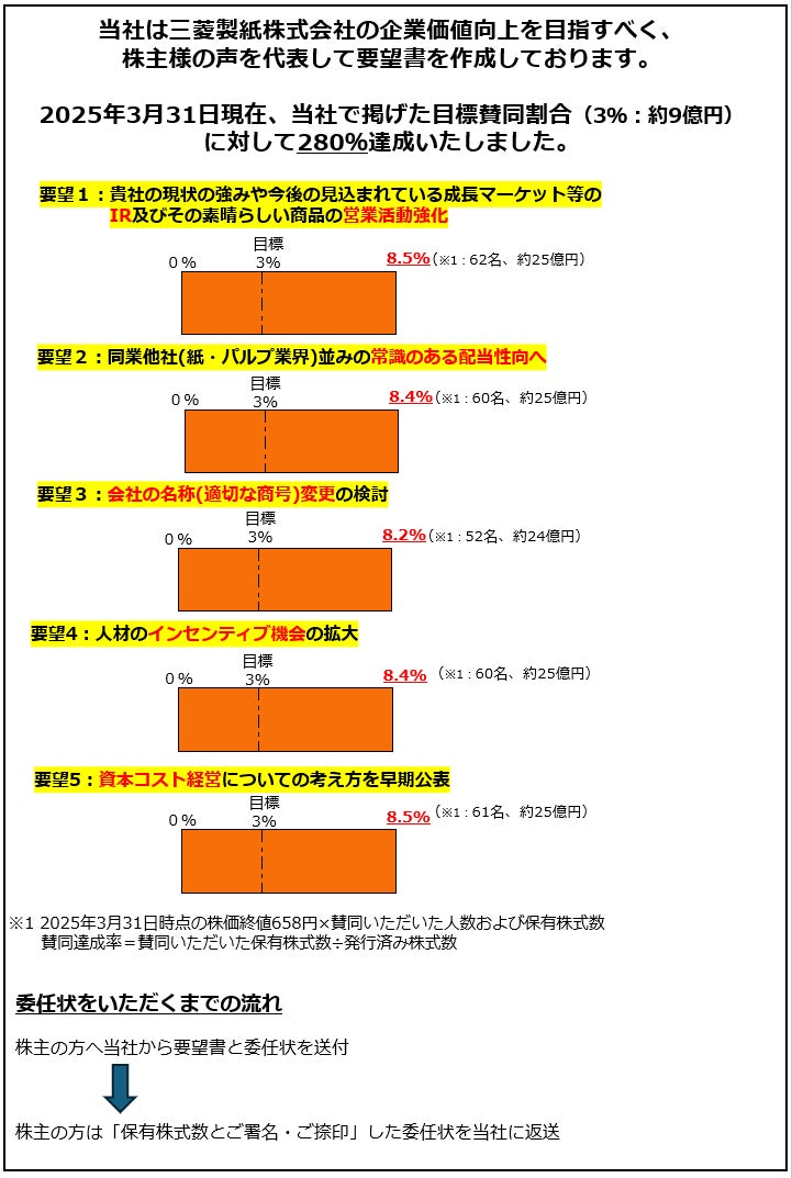 本要望書は、三菱製紙株式会社に対し、建設的な対話のための要望をお伝えするものであり、株主提案権の行使など株主としての法令上の権利を行使することを内容とするものではありません。