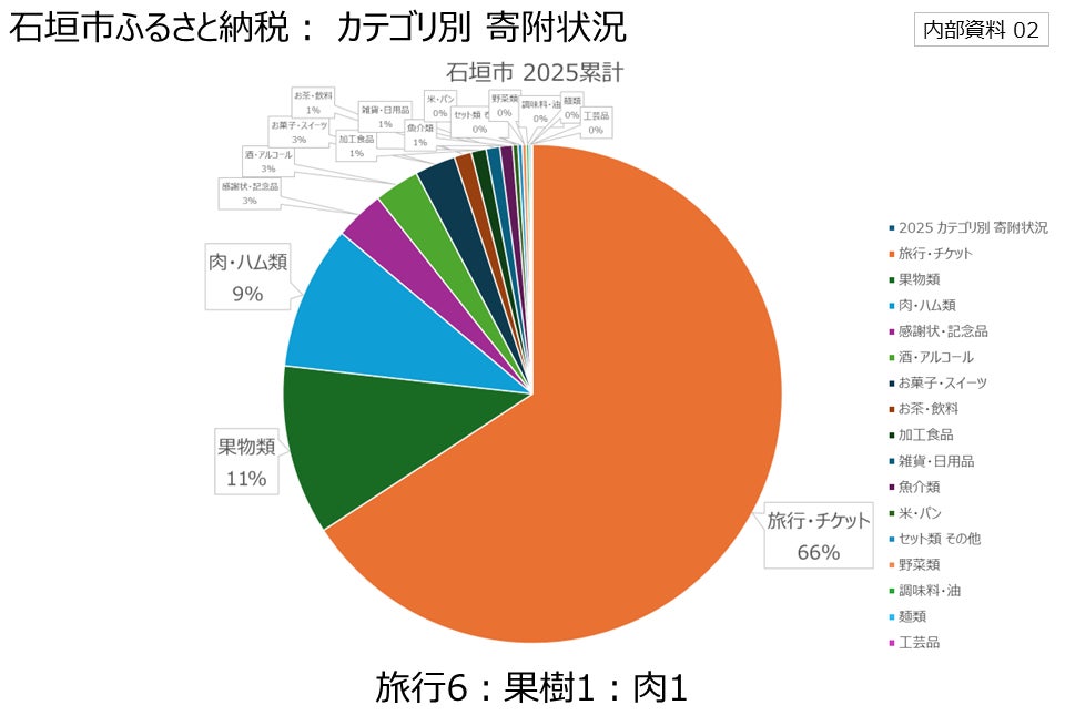 寄附額比で、旅行6:果樹1:肉1。石垣市ふるさと納税は観光分野が寄附全体を牽引する。