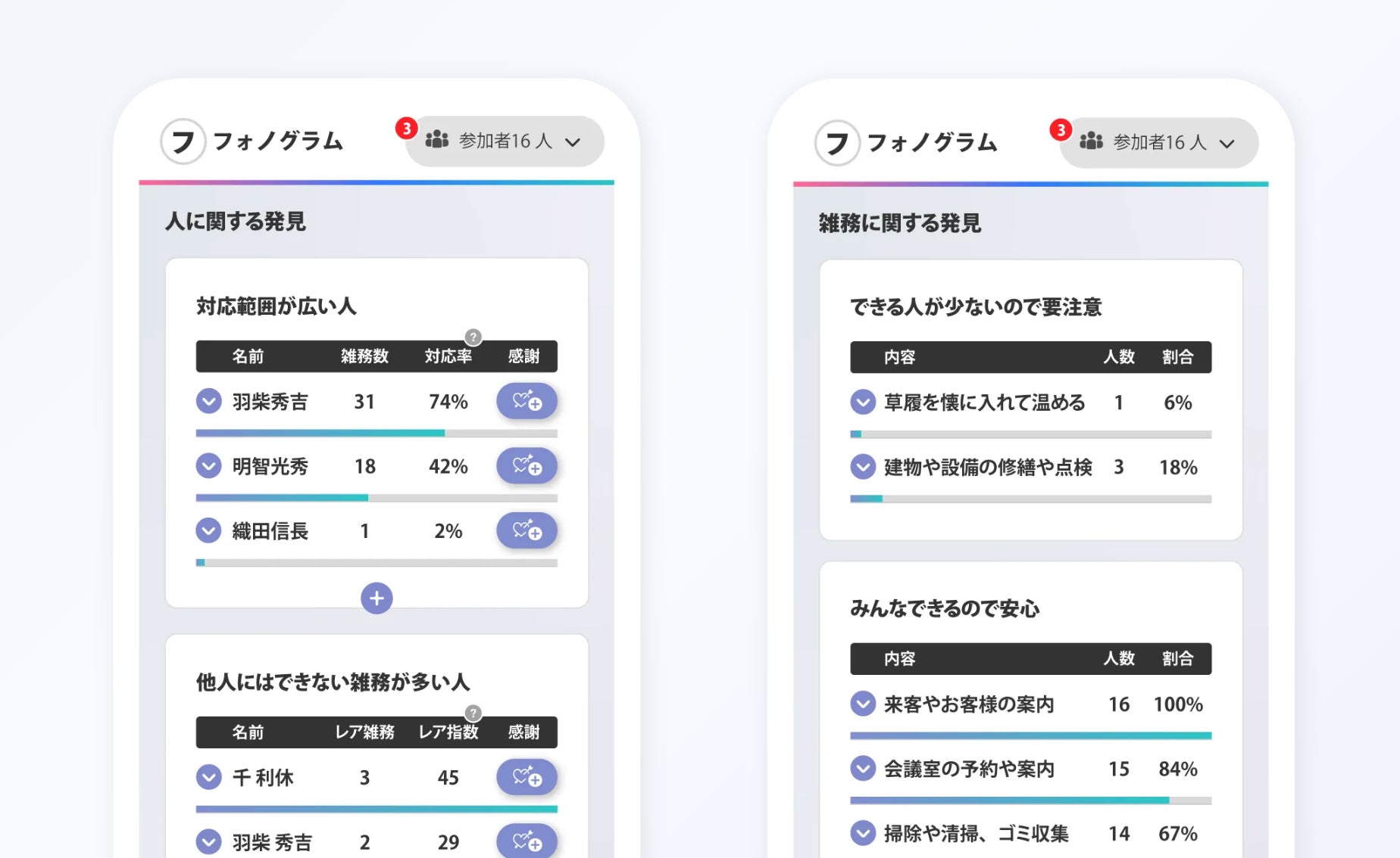 見えない貢献業務を3分で可視化、離職に至る不満をカット