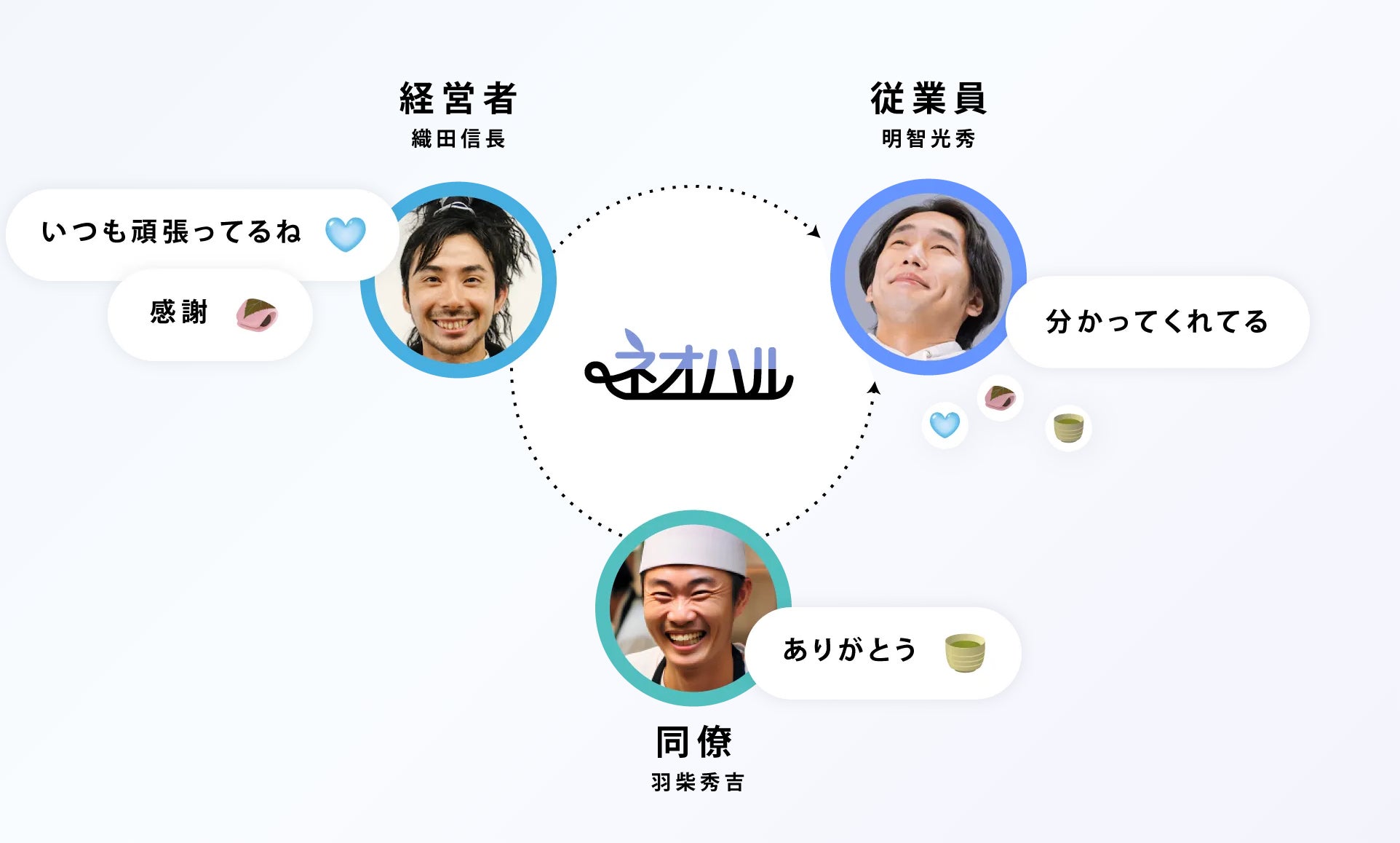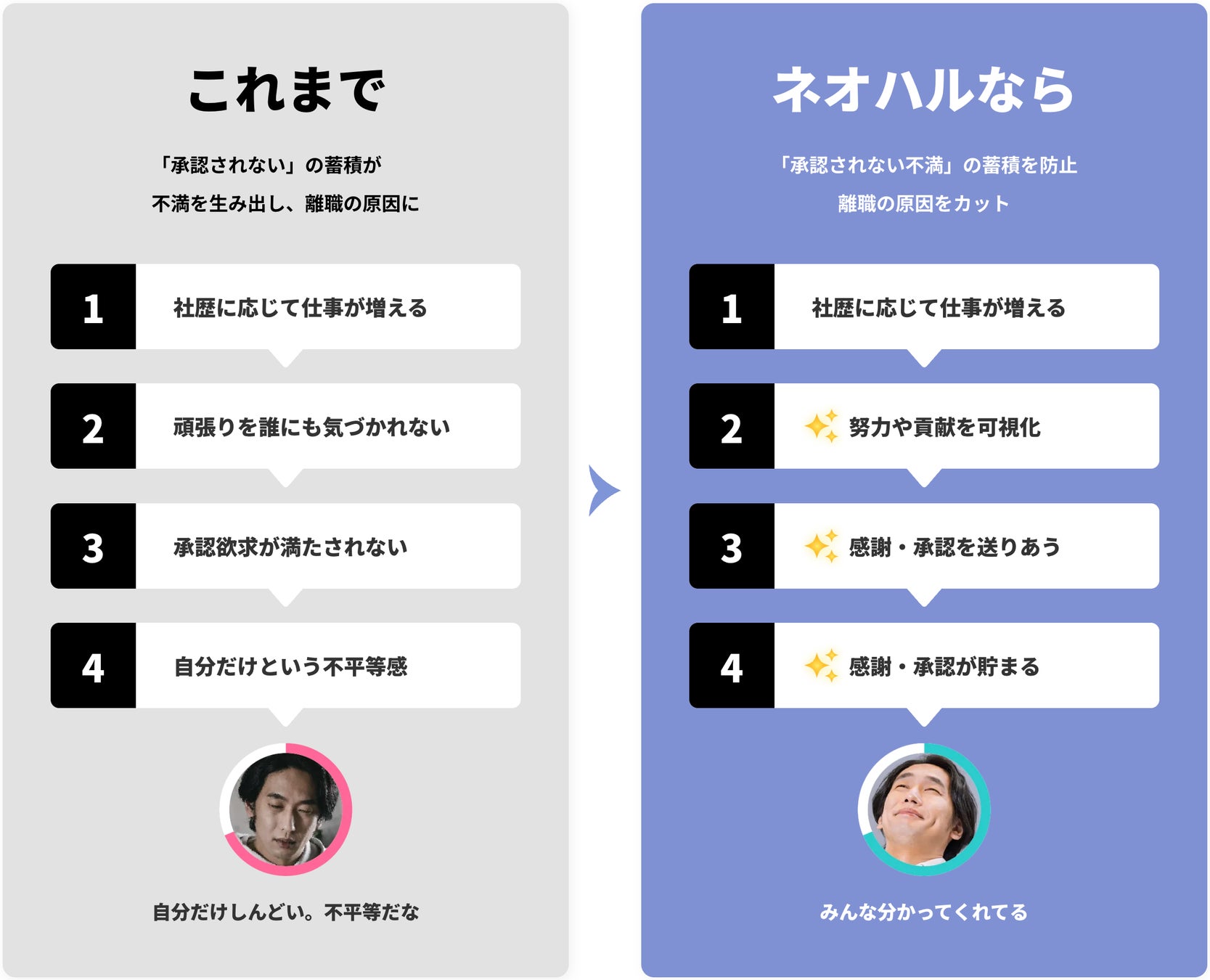 従業員の離職の主な原因の一つは、「努力や貢献が承認されない」というものです。多くの従業員がこの問題に直面しており、これが離職の決定的な要因のひとつとなっています。『ネオハル』は、この問題を解決するために、従業員の貢献を見える化し、感謝と承認を定期的に送りあう仕組みを提供します。