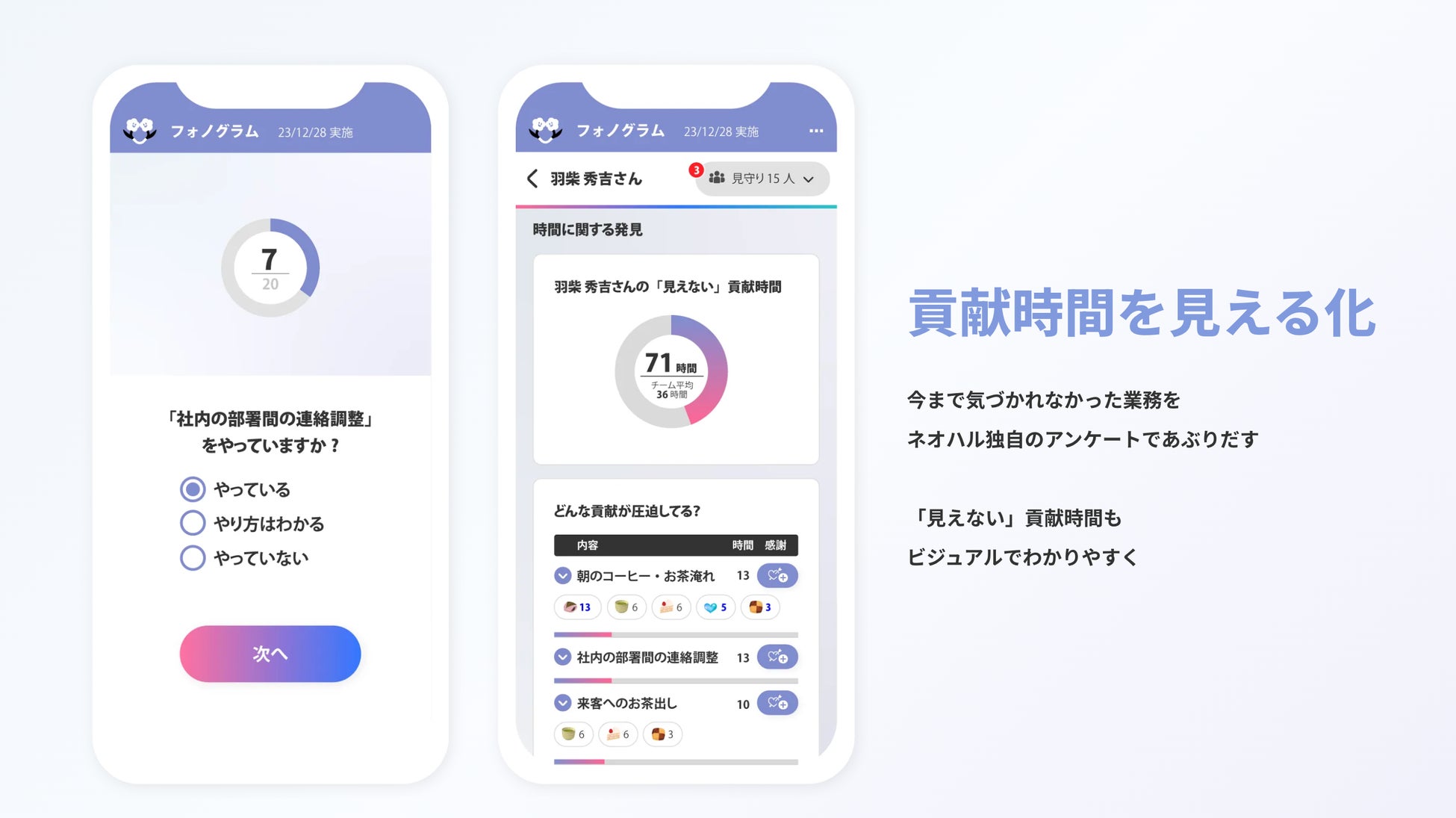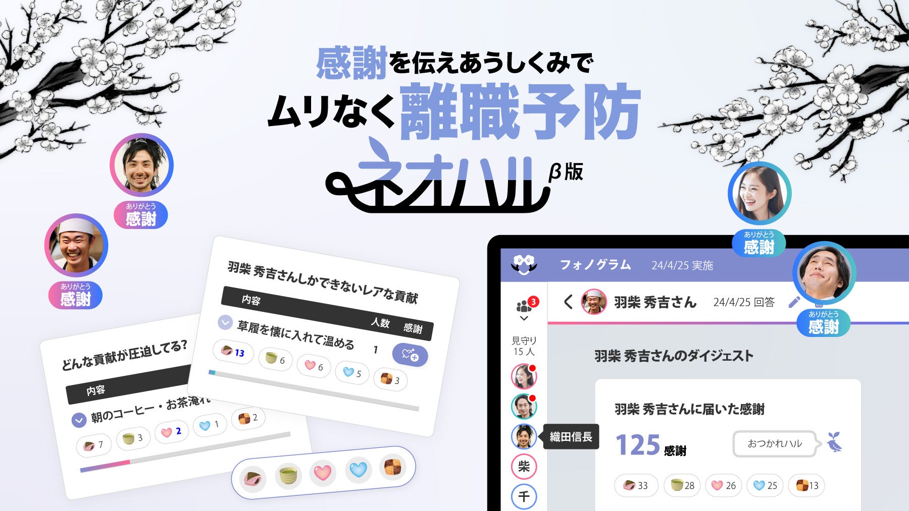 株式会社フォノグラム(本社:広島県広島市)は、中小企業の人材定着を支援すべく、少人数からでも手軽にはじめられる離職予防アプリ『ネオハル(根を張る)』β版の無償提供を本日2024年4月25日(木)に開始しました。