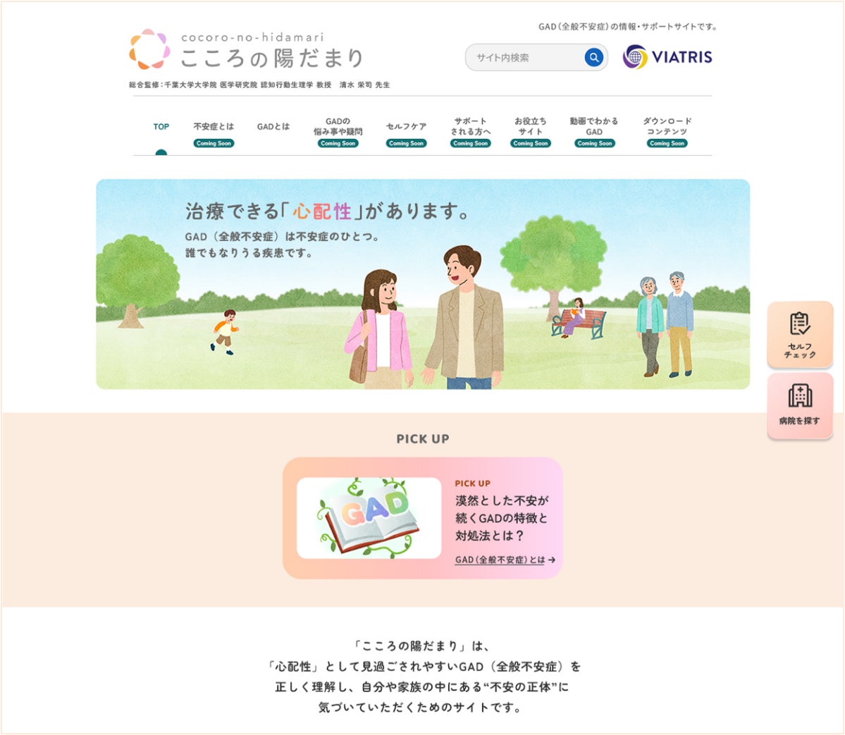 ヴィアトリス製薬合同会社(本社:東京都港区、社長:ソナ・キム)は、メンタルヘルスに関する情報を発信する疾患啓発サイト、「こころの陽だまり(https://www.cocoro-h.jp/)」において、全般不安症(Generalized Anxiety Disorder/以下、GAD)に関する新規コンテンツを拡充し、サイトをリニューアルしましたので、お知らせいたします。これまで患者さんをはじめとする一般生活者の方がGADに関する情報を入手する方法は限られていましたが、本サイトの登場により、疾患の説明から治療選択肢、セルフチェック方法、相談先の医療機関まで幅広い情報を調べることができるようになりました。