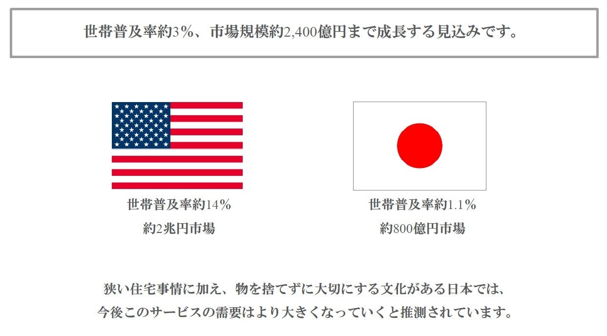 市場規模は、アメリカの場合、世帯普及率14%、2兆円です。対して日本は、世帯普及率1%、800億円の市場にとどまっています。日本での市場規模拡大の余地は非常に大きく、このコロナ期間中も市場は成長し続け、年率5.7%のペースで市場拡大しています。