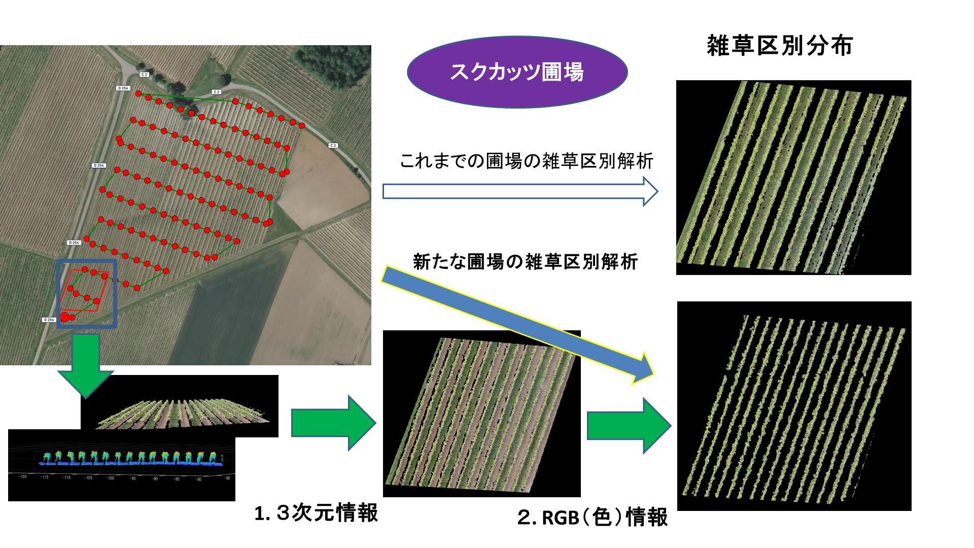ドローンで撮影した画像を色とあわせ3次元情報を加えることで、「ブドウの葉と雑草の区別分布」を可能にする新たなAI画像解析技術。この分布図は雑草と“共生”するワイン用ブドウの栽培に活用でき、農薬・化学肥料を少なくすることに役立ちます。