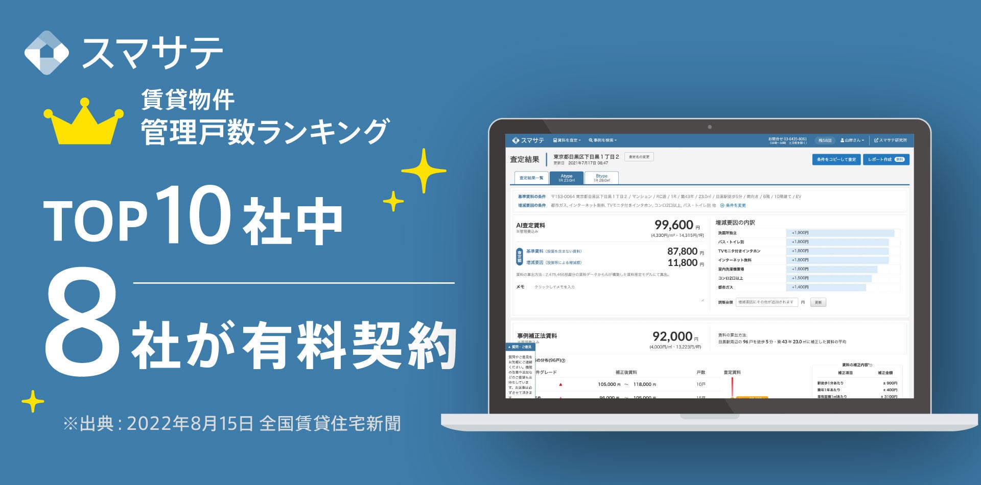 スマサテ株式会社(本社:東京都品川区、代表取締役:山岸延好)は、AI賃料査定システム「スマサテ」が全国賃貸住宅新聞社より発表された「2022年賃貸物件管理戸数ランキング(※1)」のトップ10社中8社に有料導入されていることを発表しました。