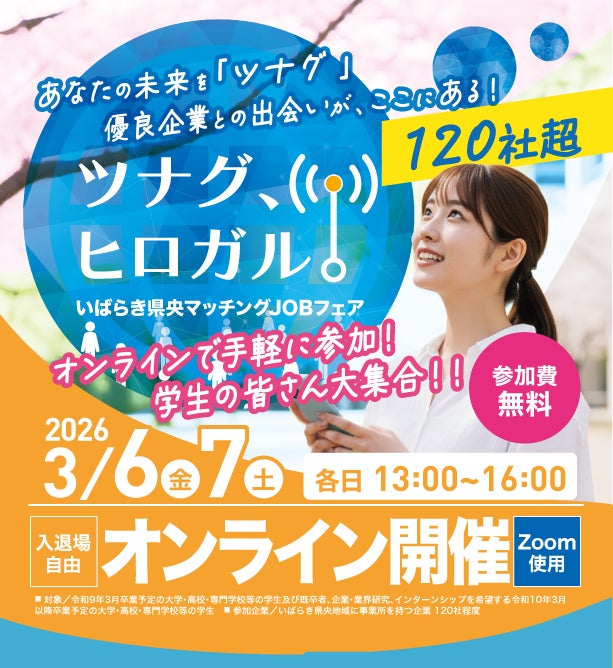 株式会社リブリッジ(所在地:東京都千代田区、代表取締役社長:石松明彦)は、いばらき県央地域商工振興協議会が主催する「いばらき県央マッチングJOBフェア」を受託事業により実施します。実施日程は2日間【2026年3月6日(金)7日(土)】で、のべ120社を超える優良企業や団体、自治体等が集結します。各日とも13:00-16:00(12:30受付|入退場自由)の開催となります。主たる対象者は、「令和9年3月卒業予定の大学・高校・専門学校等の学生」「同 既卒者」「企業・業界研究・インターンシップを希望する令和10年3月以降卒業予定の大学・高校・専門学校等の学生」です。