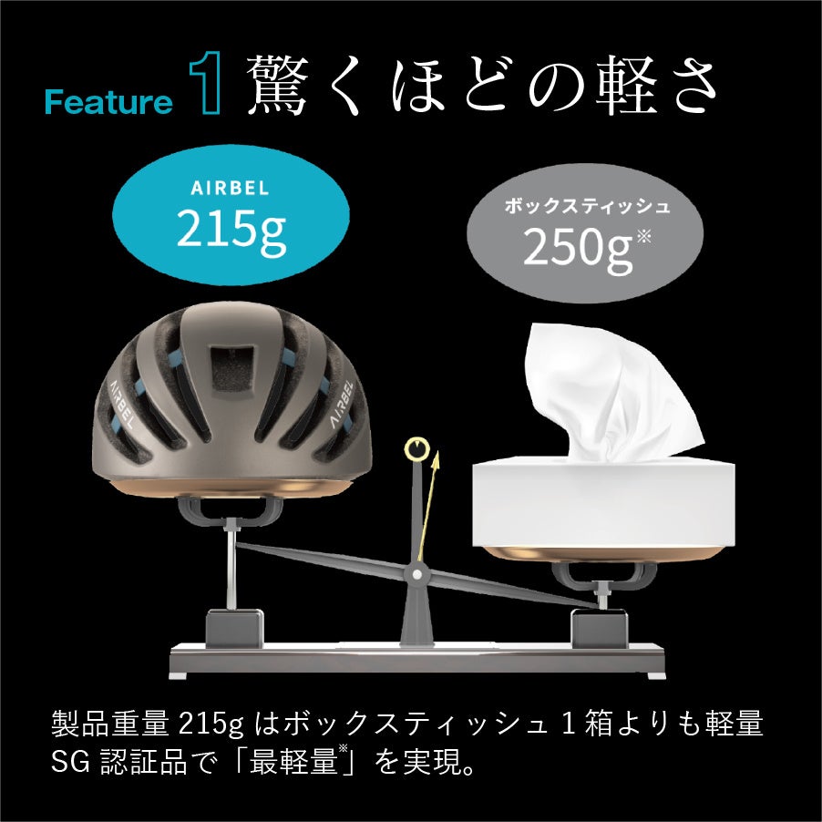 「AIRBEL®」は、安全基準のSGマーク(一般財団法人 製品安全協会)認定のヘルメットとしては業界最軽量の215gとなります。箱ティッシュ1箱の質量(凡そ250g)よりも軽量で、まるでかぶっているのを忘れるかのような新感覚のヘルメットです。