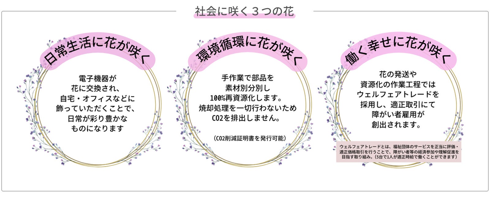 『花咲くスマホ回収プロジェクト』では、寄付された機器を手作業で分別し100%リサイクル。限りある環境資源を守ると同時に、分解作業や花のご用意においてウェルフェアトレード(障がい者雇用に適正価格取引を行う)の障がい者雇用の促進に繋げます。