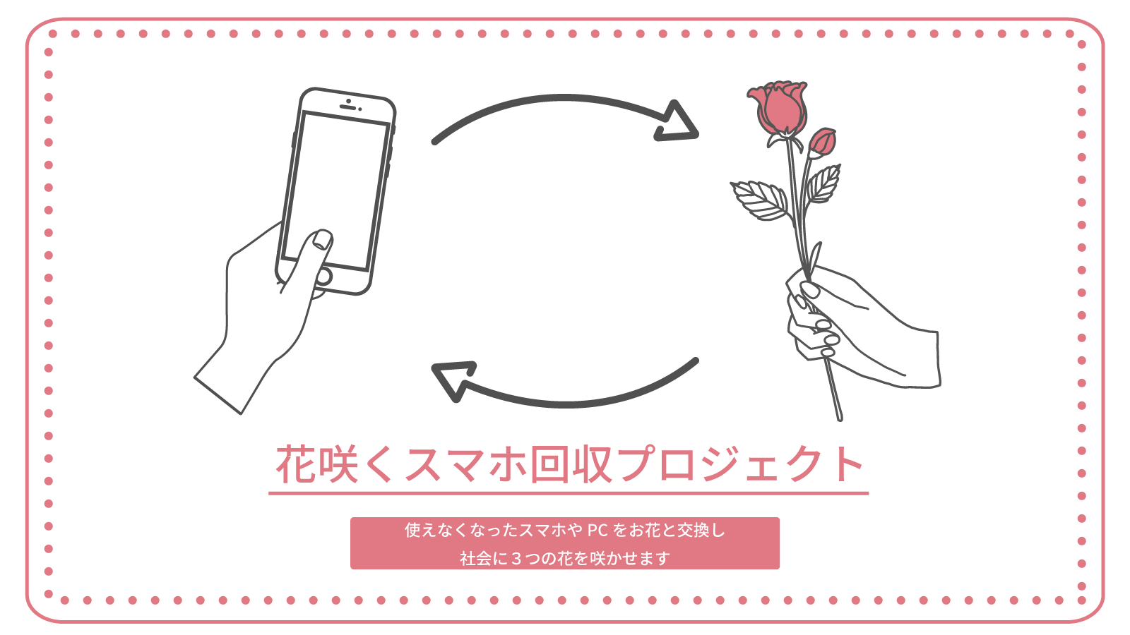 個人のお客様はもちろん、企業様・学校など団体でのご参加も歓迎いたします。『花咲くスマホ回収プロジェクト』を通して、あなたの使わなくなったスマホが地球を守り、世の中を優しく循環させ、社会に咲く花となります。ご協力よろしくお願い致します。