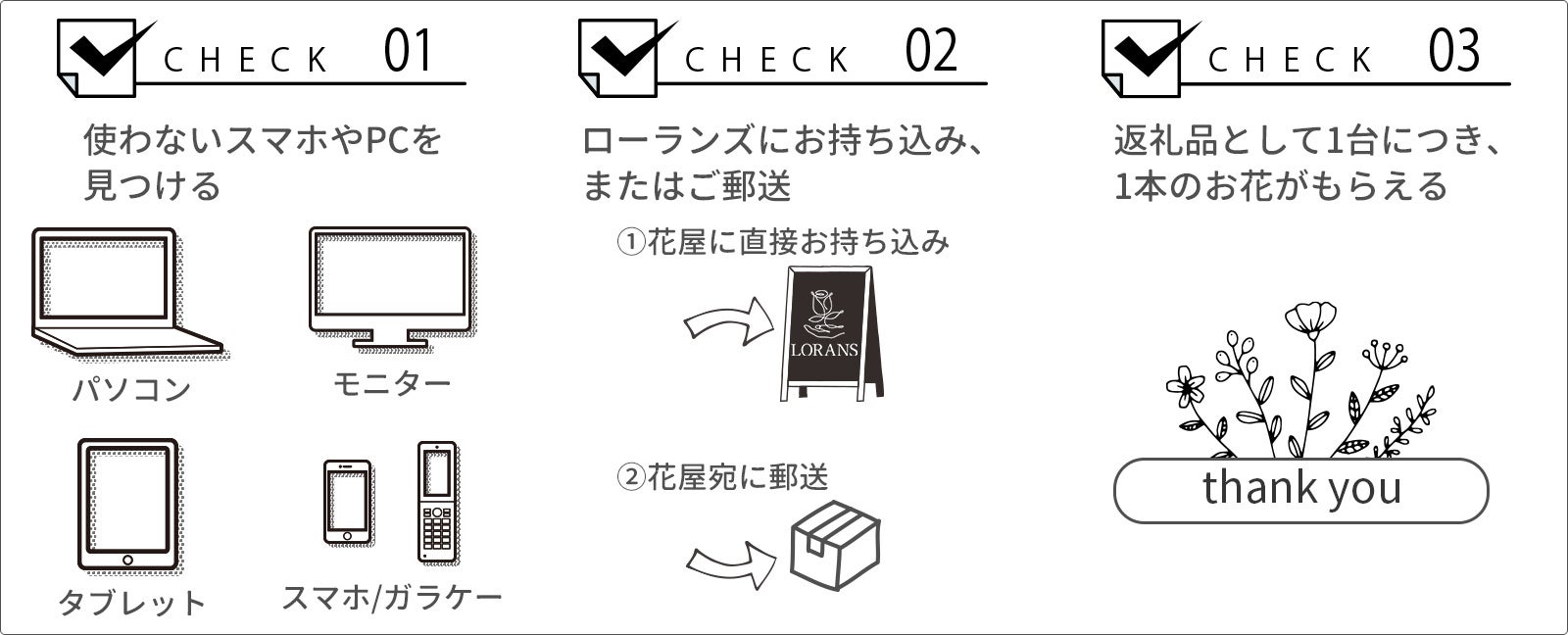 使わなくなったスマホやPCを「ローランズ」 原宿店、天王洲店に持ち込みまたは元払いでご郵送ください。(※郵送持ち込みの場合条件あり)寄付のお礼として電子機器1台につき1本のお花をプレゼントします。