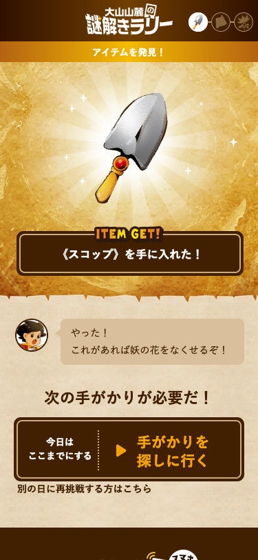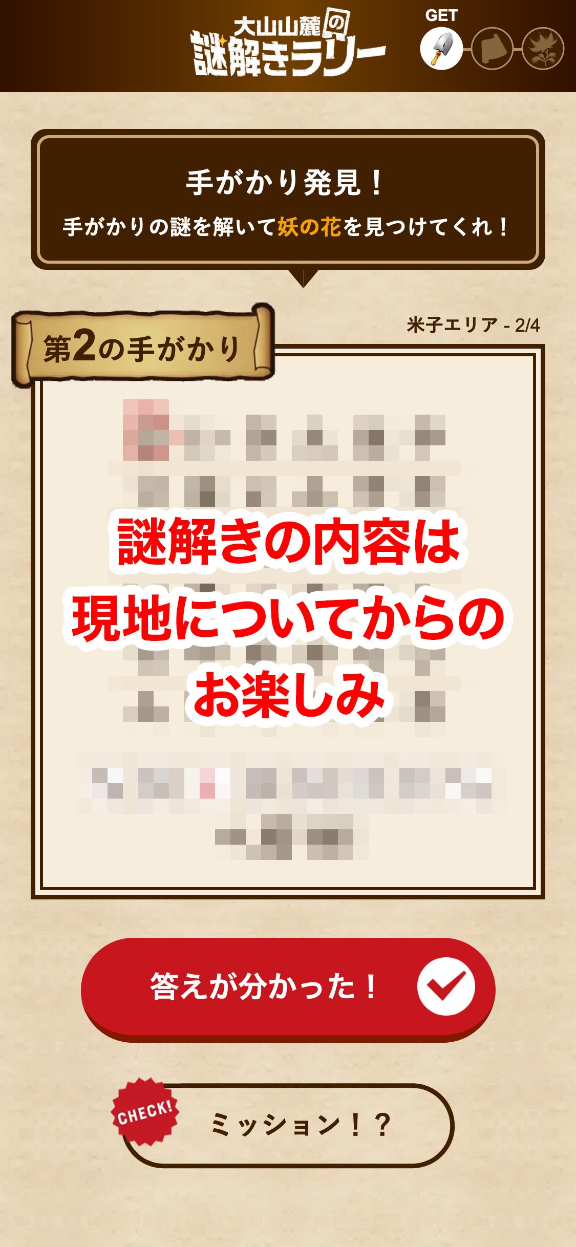 参加者は人々の笑顔を取り戻すため、各地に残された手がかりの謎を解いて「妖の花」を探す旅に出かけます。次々と課されるミッション+アイテム集めでクリアを目指すRPG⾵の楽しい仕組みとなっています。