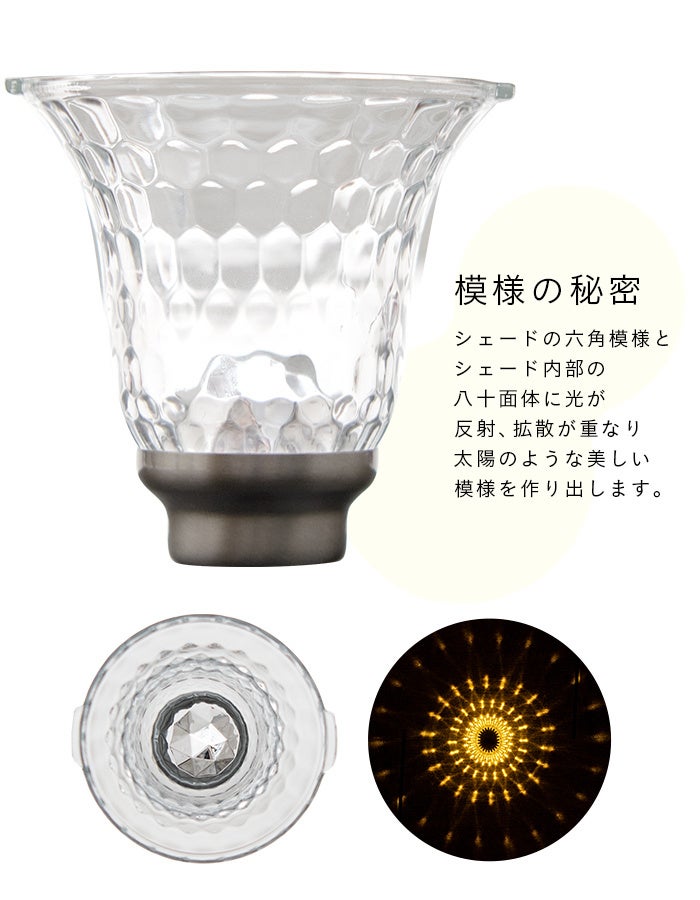 その模様の秘密はシェードにあります。シェードの六角模様と内部にある八十面体に光が当たり、折り重なることで太陽のような美しい模様を作り出します。
