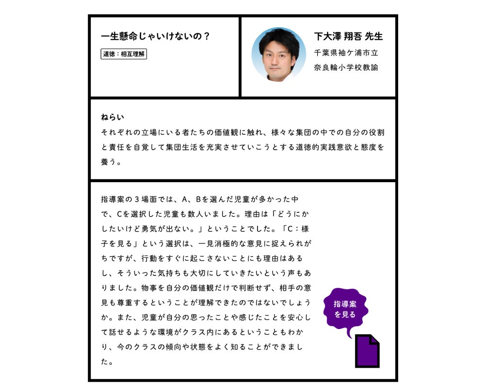 現在、文部科学省により「考え、議論する道徳」を行うことが推奨されている現状を踏まえ、私たちは2〜3分で内容や論点がすべての子どもに理解できるマンガ形式の教材を開発しました。そして内容の理解や作品への興味関心を高めるため、子ども向けのコンテンツをつくるプロフェッショナルであるマンガ作家やイラストレーター、編集者、映像ディレクター、デザイナーが参加し、人物の心情や人間関係がリアルな作品をつくりました。開発後、検証授業を複数の学校で行いましたが、ねらい通り、対話の時間がたっぷり確保でき、活発な議論が生まれる授業になっていました。