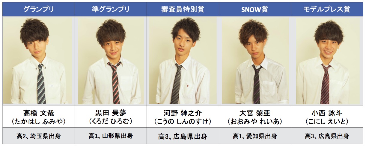準グランプリには山形県出身の高校1年生・黒田 昊夢(くろだ ひろむ)くんが選ばれました。さらに審査員特別賞には広島県出身の高校3年生・河野 紳之介(こうの しんのすけ)くんが、SNOW賞には愛知県出身の高校1年生・大宮 黎亜(おおみや れいあ)くんが、モデルプレス賞には広島県出身の高校3年生・小西 詠斗(こにし えいと)くんが選ばれました。