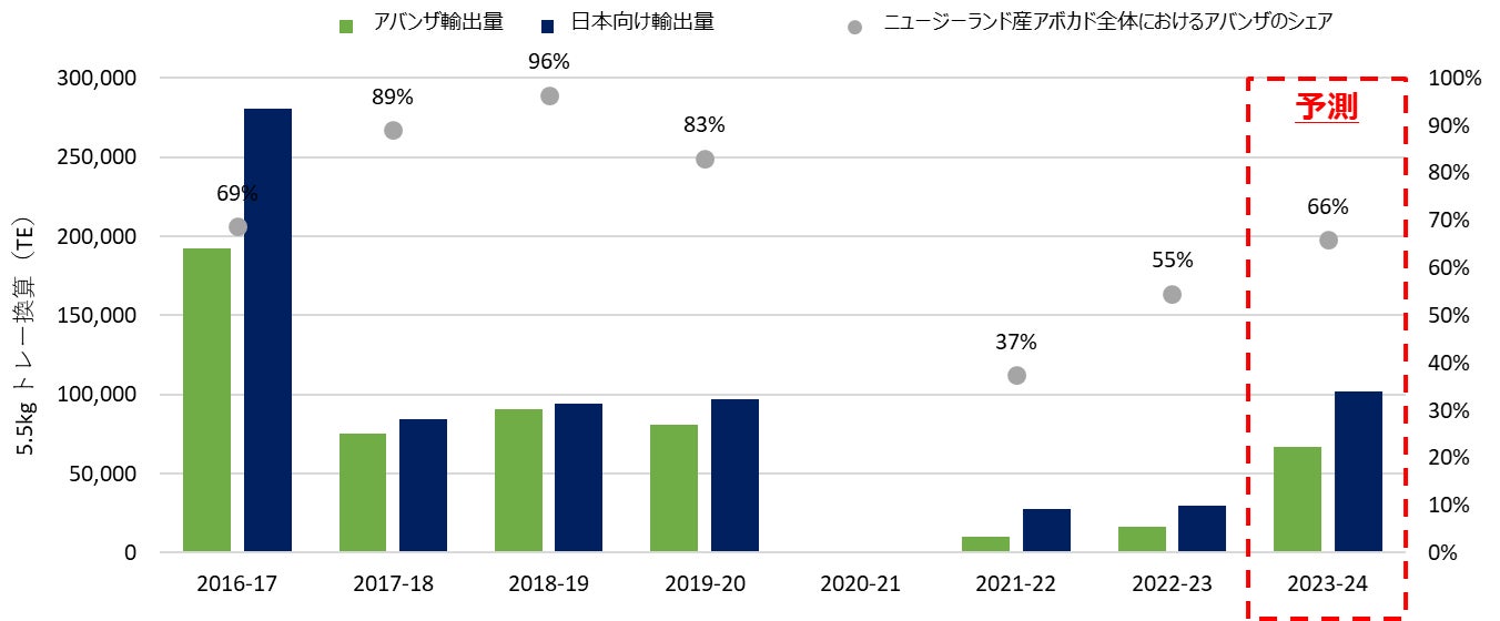 日本市場におけるニュージーランド産アボカドの輸出量とシェア