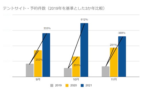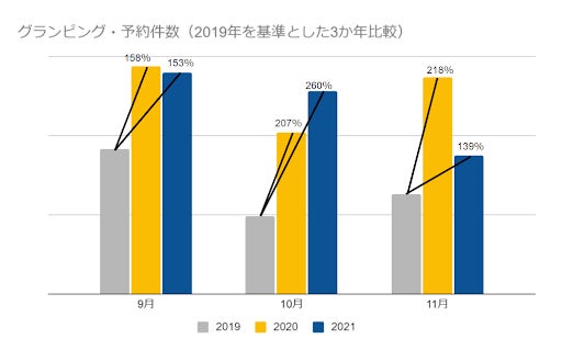 夏に引き続き屋外で風通しの良いテントサイトが伸びており、特に10月はコロナ前の2019年同月比で約6倍と大きく伸びました。グランピングや箱モノ(※)については9月、10月は昨年同等または上回る数値となっておりますが、11月は昨年を下回っております。昨年のこの時期はGOTOトラベルキャンペーンが実施されており、グランピングや箱モノも対象となっていたため、その反動とみられます。