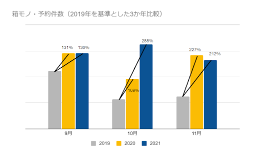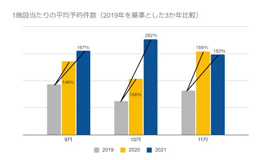 9月、10月は好調だった昨年をさらに上回る予約件数で、特に10月はコロナ前である2019年の約2.8倍の予約件数でした。新型コロナウィルスの感染拡大が落ち着いてきたこと、また、秋以降は台風等の影響が少なく、天候にも恵まれたことが要因と考えられます。