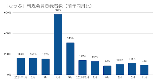 10月までは、昨今のキャンプ人気に加え、新型コロナウイルスの感染拡大が落ち着いてきたこともあり、予約数は前年を上回りました。11月についても、昨年同時期に実施されていたGOTOトラベルキャンペーンが今年は実施されておらず、また、昨年あった3連休が今年はなかったにもかかわらず、昨年とほぼ同水準となっており、引き続き好調となっています。