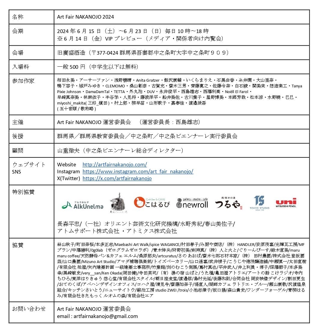 Art Fair NAKANOJO 運営委員会は、18年続く国際現代芸術祭・中之条ビエンナーレが開催される町、群馬県中之条町にて、アーティスト主導の新たなアートの見本市「Art Fair NAKANOJO 2024」を開催します。
