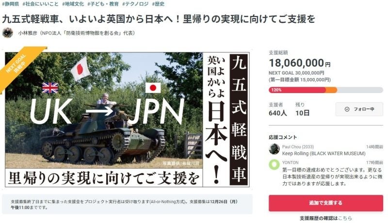 現在クラウドファンディングプロジェクトは、ネクストゴールの3000万円を目指し、12月26日(月)23時まで実施中。二台目、三台目と日本製の技術遺産の里帰りが実現出来るように、調査渡航費、状況によっては手付金等に充てる費用を募っている。