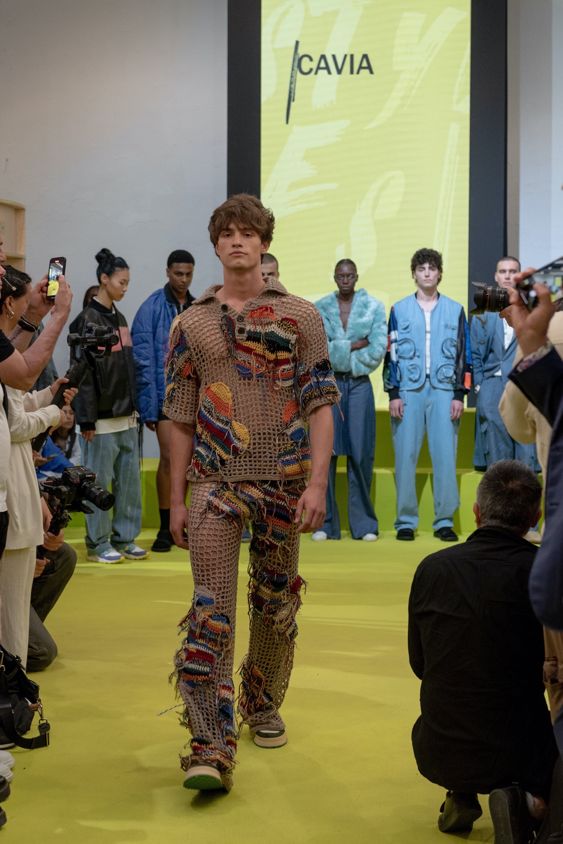 S|Style展に選抜された、創造性とデザイン性を両立させながら社会や環境にも責任あるものづくりに努める新進気鋭の10ブランドは、Kering MILが設定した厳正なサステナビリティに関する基準のもと、最先端かつ環境負荷の低いデザインと製造工程について徹底した指導を受け、新しいルックを創り上げました。その中で、衣服の再利用とアップサイクルを取り入れながら洗練されたニットウェアで高い評価を受けるイタリアのブランド「Cavia」は、Brewed Protein繊維で作られた限定ニットトップスとパンツを製作し、会期中のブースでの展示、および6月14日に開催された会場内でのファッションショーにて発表しました。