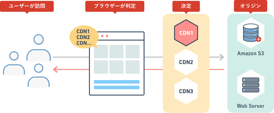 クイックキャッシュCDNでは、CDNサービス側の他にユーザーに最も近いブラウザで最適なCDNを判定し高度負荷分散を行います。