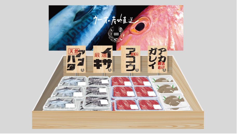 また、昔の魚屋で買っていたような”刺激的な出会い”を表現すべく、トロ箱(木箱)をベースにPOPを展開します。