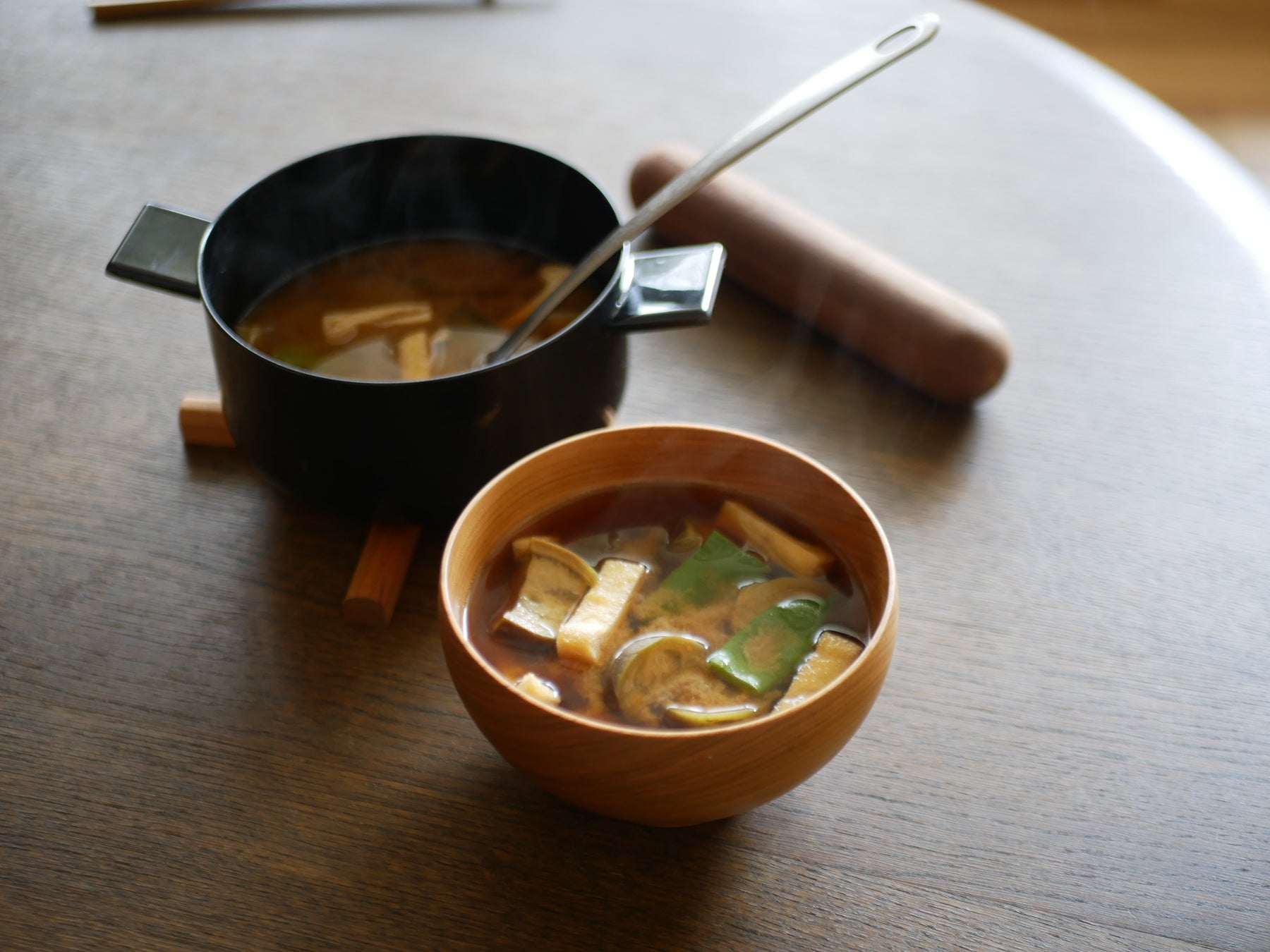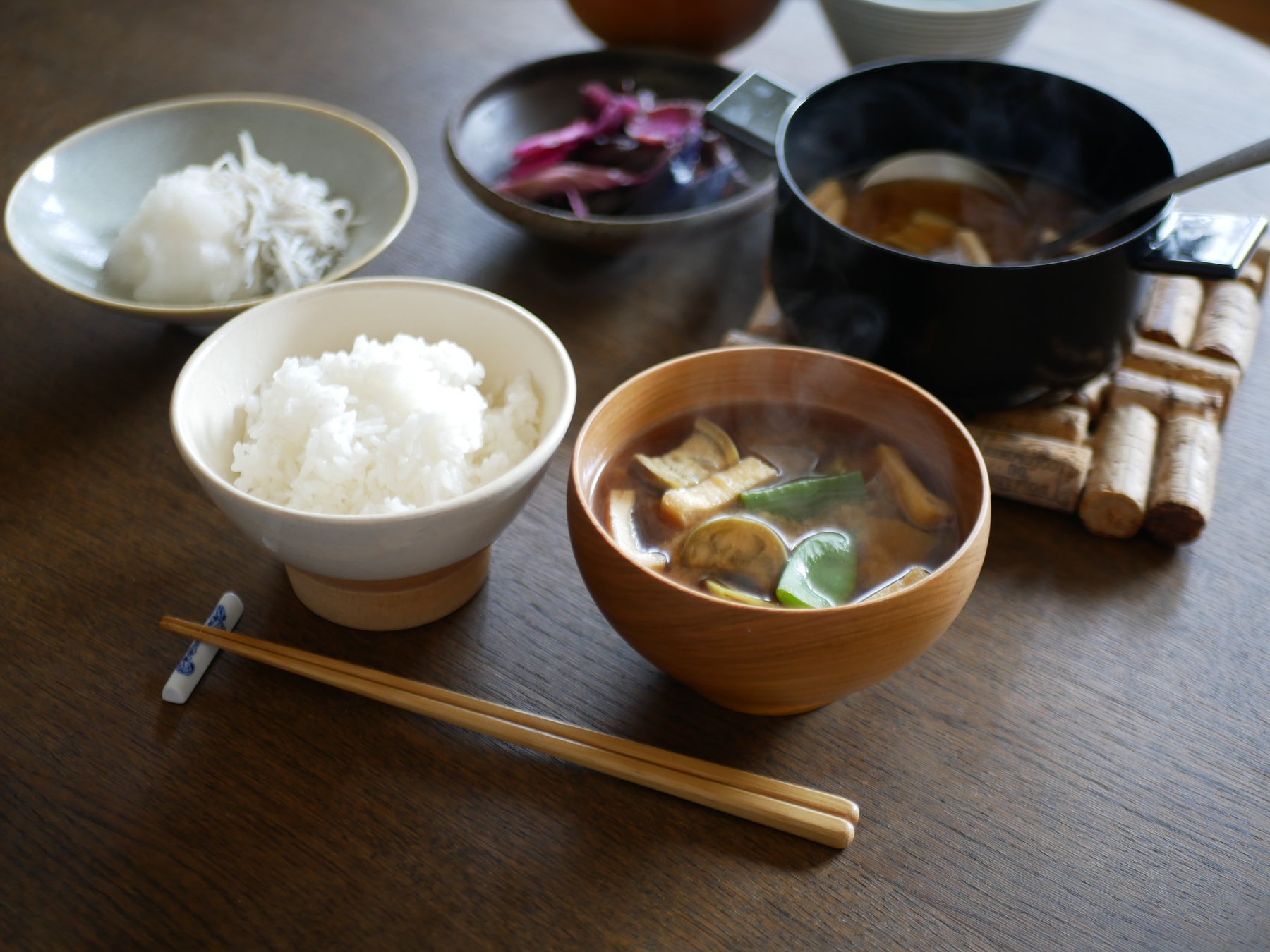 1日目はなすとモロッコいんげんの味噌汁、2日目は刻みネギやみょうがを散らして。