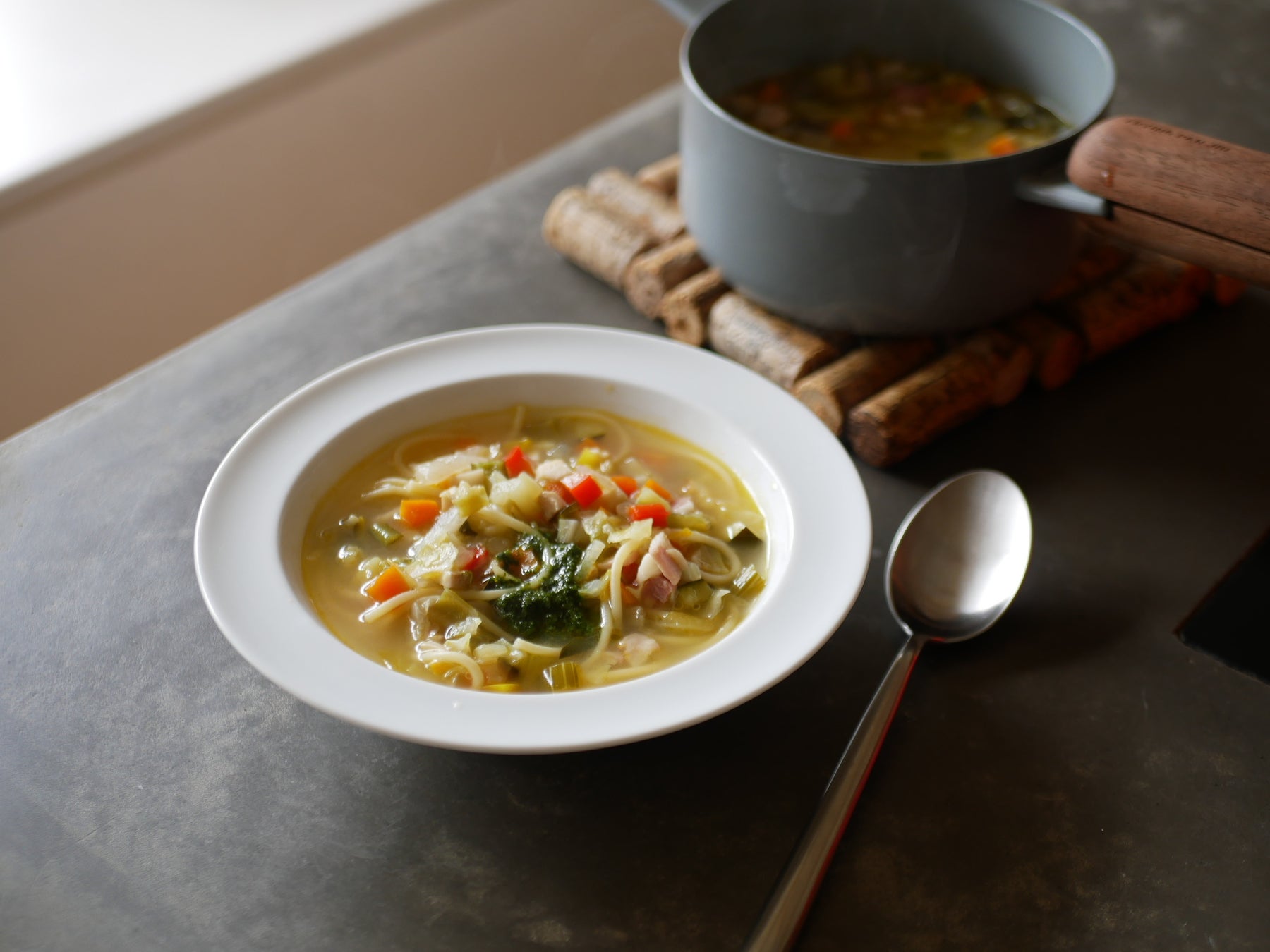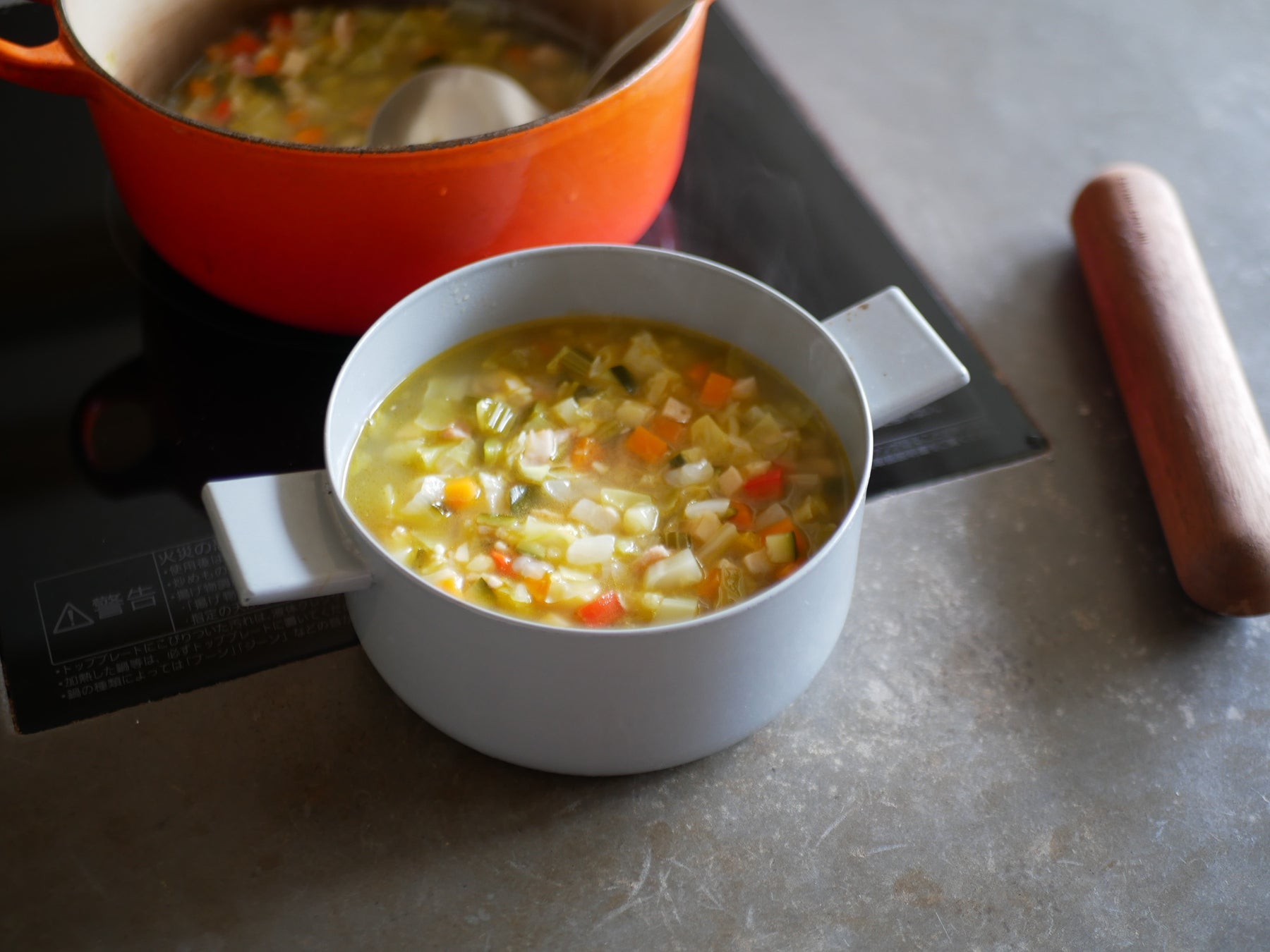 野菜スープは、野菜とちょっぴりのベーコン、塩とオリーブオイルだけで作った、ミネストローネみたいなシンプルなスープです。塩だけの味付けにしておくことで、あとからトマトを足したりパスタを入れたりとアレンジがききやすくなります。
