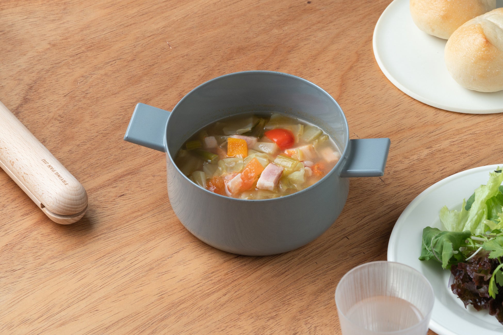 スープや味噌汁は、たっぷり作るほうがおいしくできるもの。スープ作家として50個ほどの鍋を使ってきましたが「保存するための鍋」には初めて出会いました。コンパクトで重ねることもでき、冷蔵庫にも入れやすい。リアルな暮らしの中で生きる鍋だと思います。