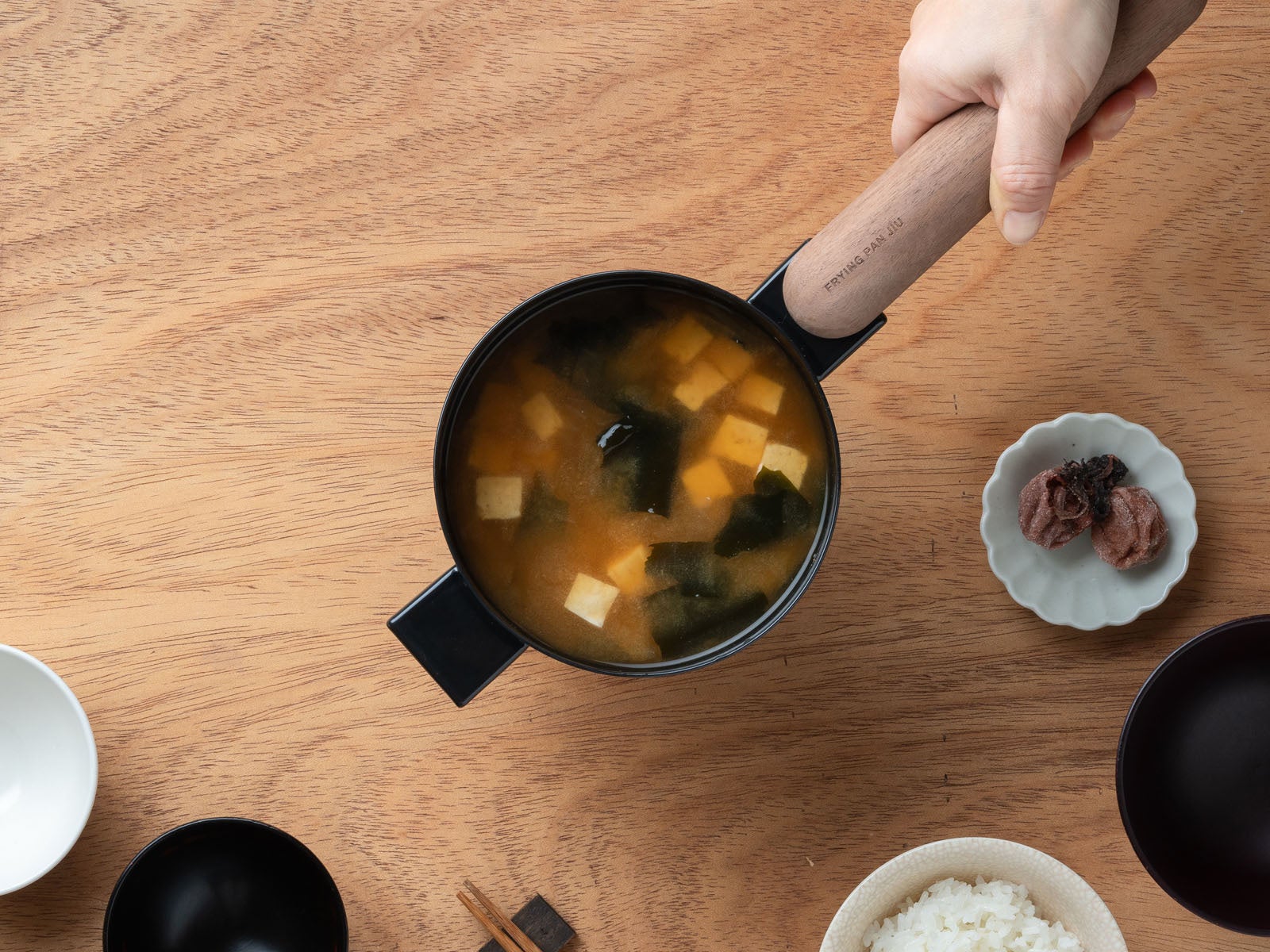 デザインは、丸みを帯びたミニマルデザインを採用。ホーローの深い艶と相まって、食卓にも馴染む佇まいを誇ります。直径約14cm・容量は1,000mlと1〜3人分の調理に適したサイズ感で、一人暮らしからファミリーまで幅広く対応。味噌汁はもちろん、トマト煮込みやキムチチゲといった酸の強い料理にも活用いただけます。
