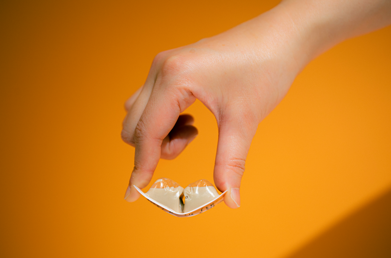 形状は調味料で使用される「パキッテ」を、利便性を考えて世界で初めて使用しました。