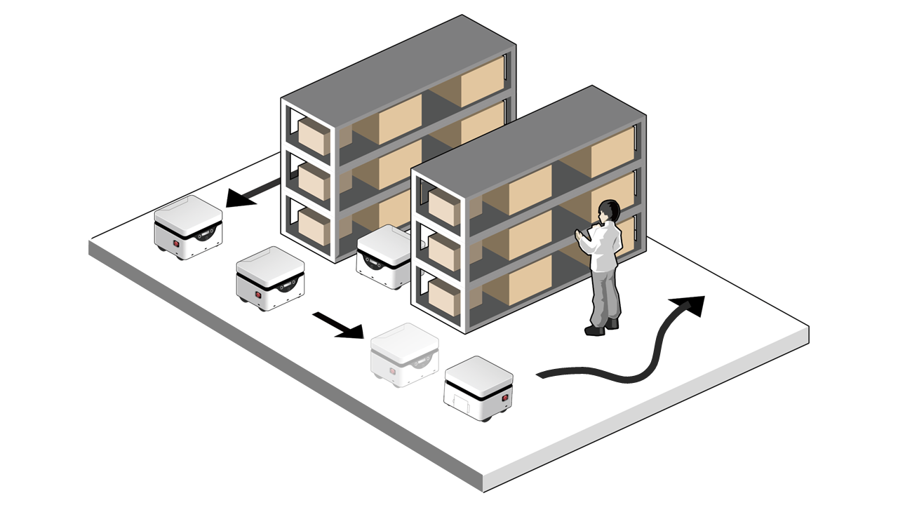 交通整理:複数台の KeiganALI がマップ及び経路情報を共有し、衝突を防ぎながら最適なルートで走行