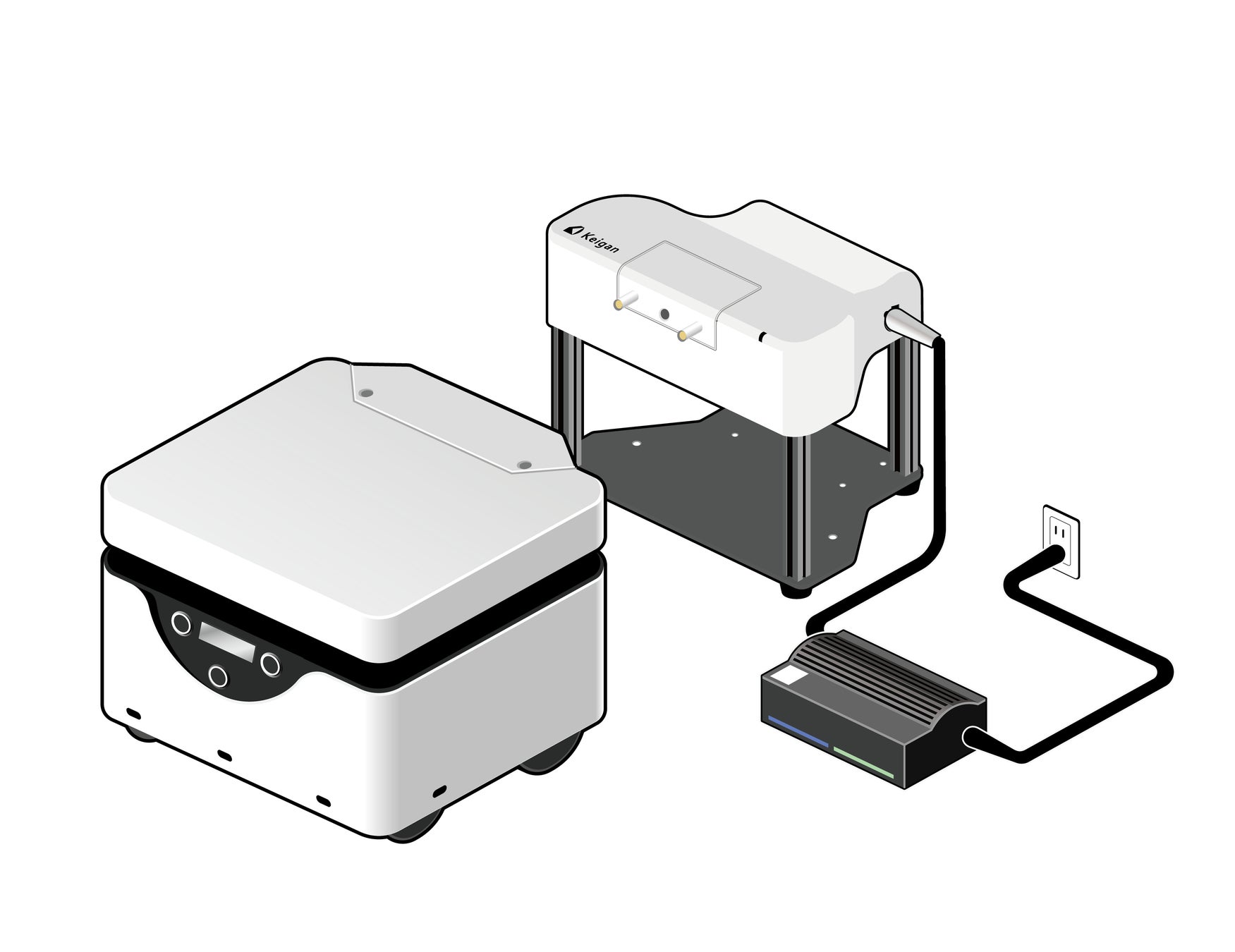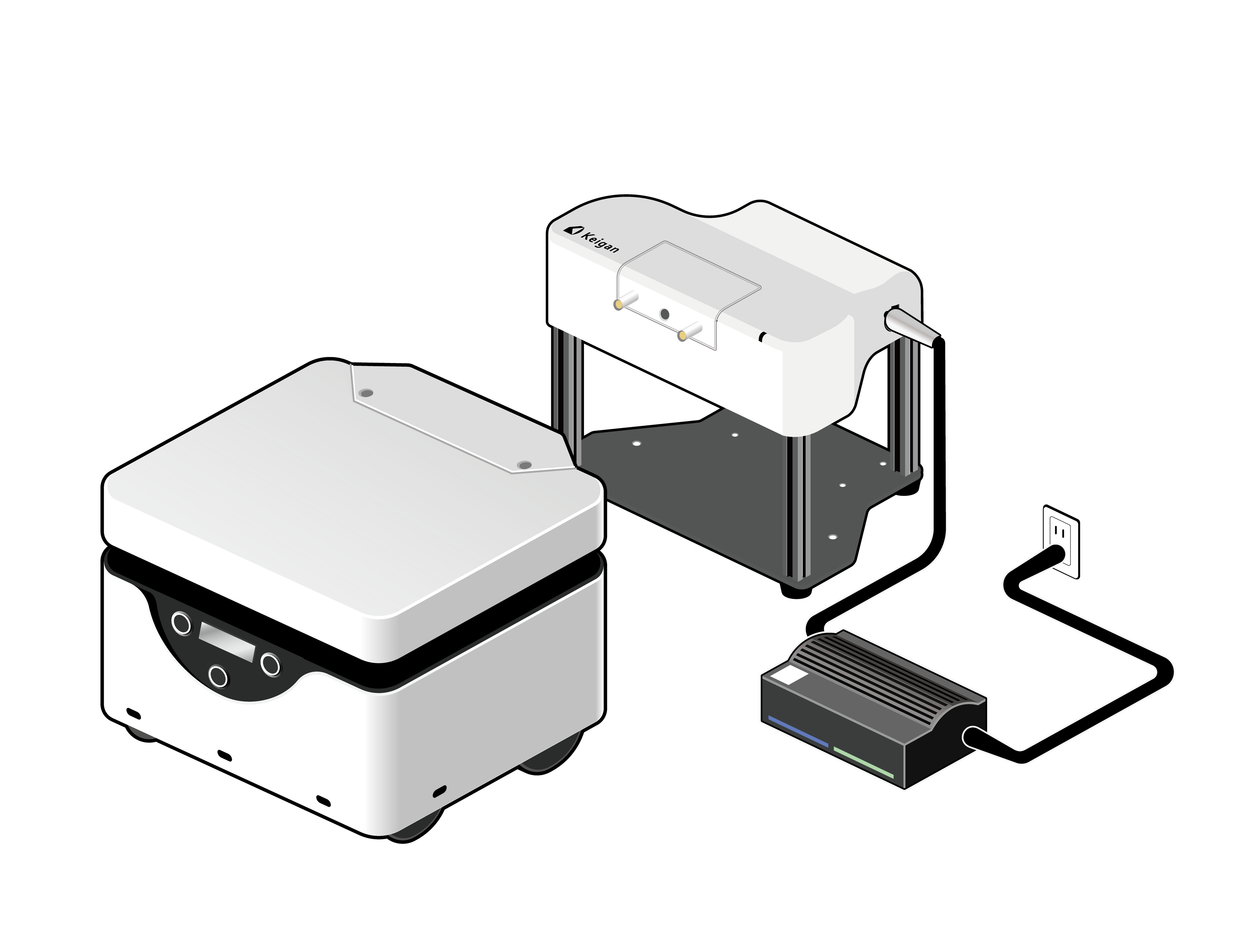 充電ステーション(床面に設置)および充電モジュール(KeiganALIに取付)