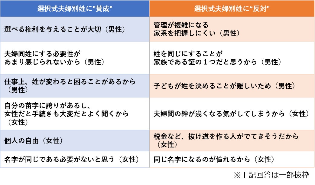 賛成派の主な意見として、「個人の自由」や「選択肢の拡大」が挙げられました。現代社会では、仕事やアイデンティティに対する考え方が多様化しており、姓の変更によって起こる、仕事上での困難や行政手続きの煩雑化への懸念が強く表れています。