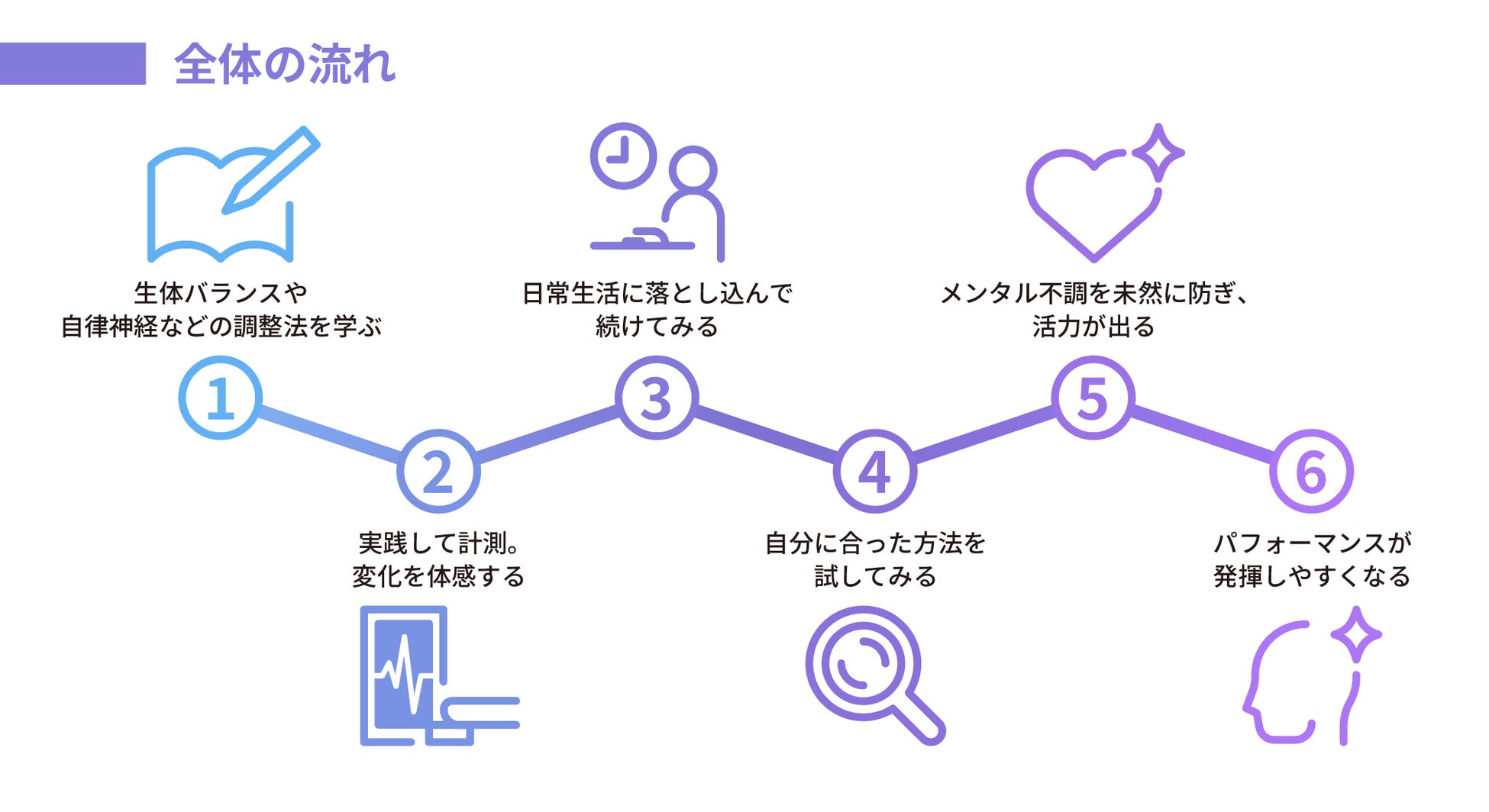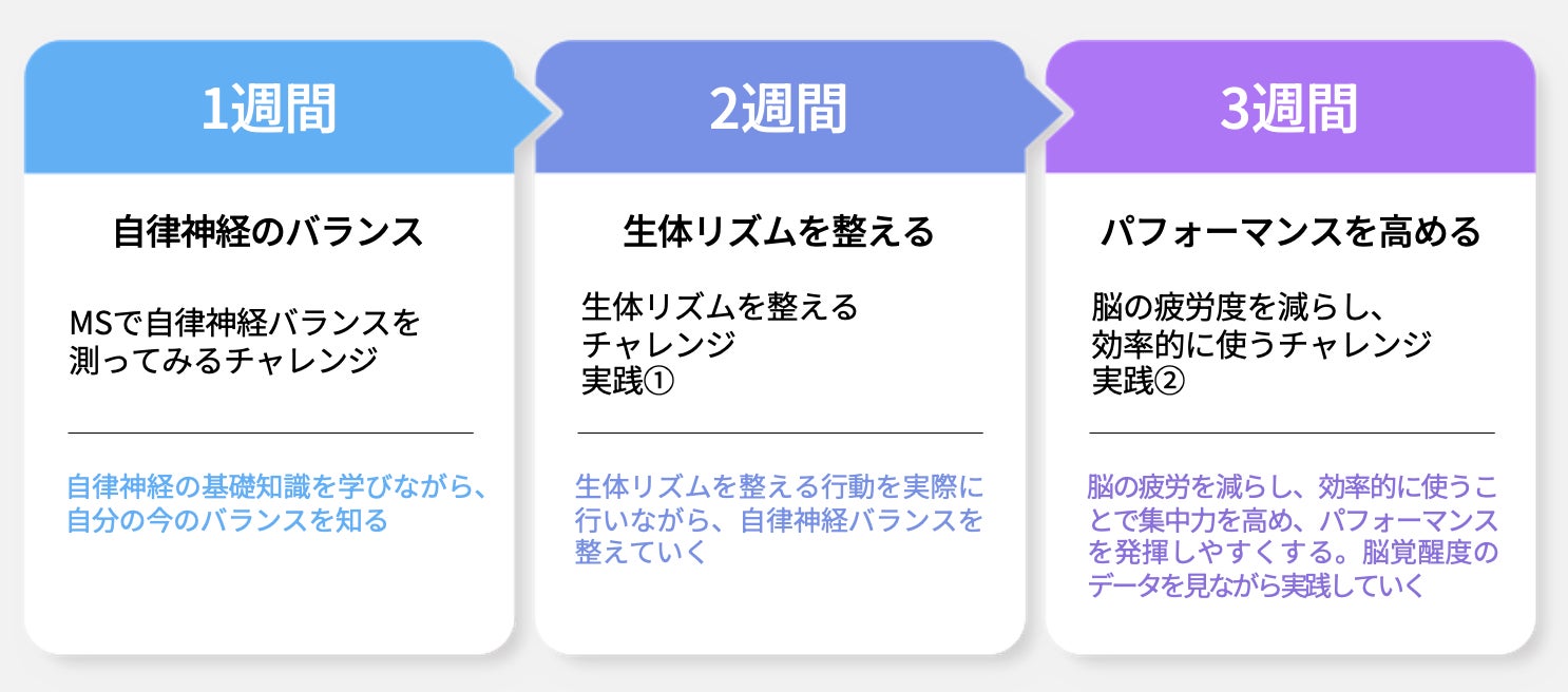 このプログラムは eラーニング形式で行い、生体測定により今まで自覚出来ていなかった今のメンタル状態を知って、生体リズムを整えることで、パフォーマンスを発揮しやすくする事を目的としています。具体的には睡眠の質や仕事の達成度の向上、イライラや不安の解消などの効果が期待され、仕事やスポーツなどでパフォーマンスを発揮したい人にご活用して頂ける内容になっています。生体リズムを整えることで美容やダイエットなど様々な効果も期待でき、”やりたいことができる”充実した心身の状態をキープしていくことから Well beingツールとしてお使い頂けるプログラムです。