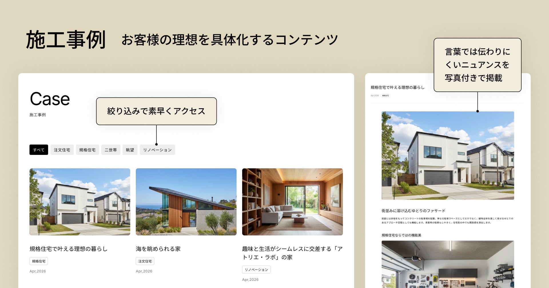 建物の外観やこだわりポイントを写真付きで解説することで、コンテンツの魅力を最大限に引き出します。