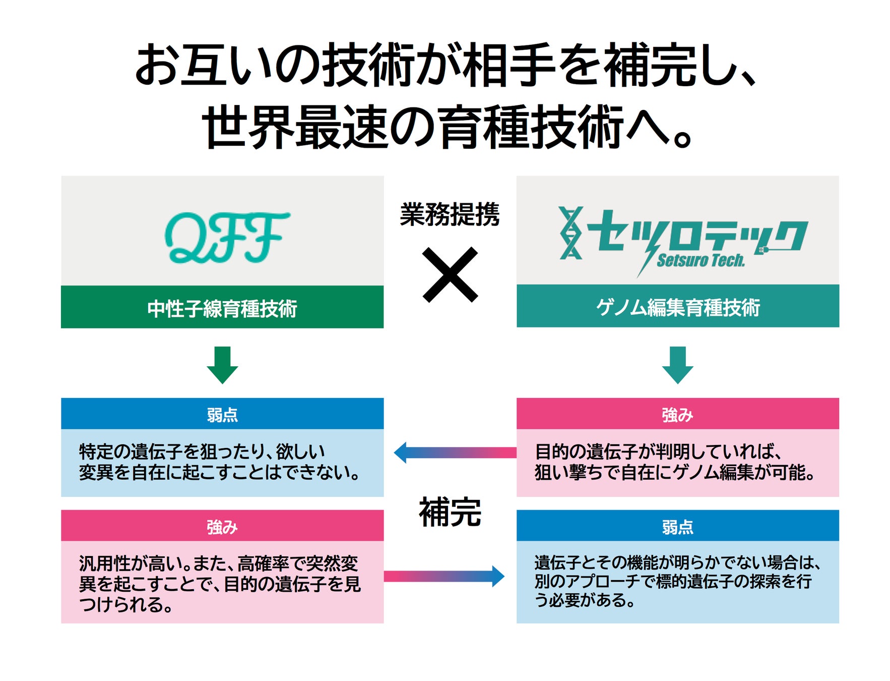 セツロテックは、生物の遺伝子を自在に編集できるゲノム編集技術を活用し、農業畜産分野における新品種開発を支援する研究開発受託サービス「PAGEs」を展開しています。これまで、ニワトリやブタなどの畜産動物の開発から始まり、植物や微生物など多様な生物種へと開発対象を広げてきました。一方、QFFは、放射線の一種である「中性子線(量子線)」を用いた「量子バイオテクノロジー」として「中性子線育種」を世界で初めて社会実装したディープテック・カンパニーであり、種苗などに中性子線を照射し突然変異を高確率で誘発する「スピーディ育種」サービスを展開しています。
