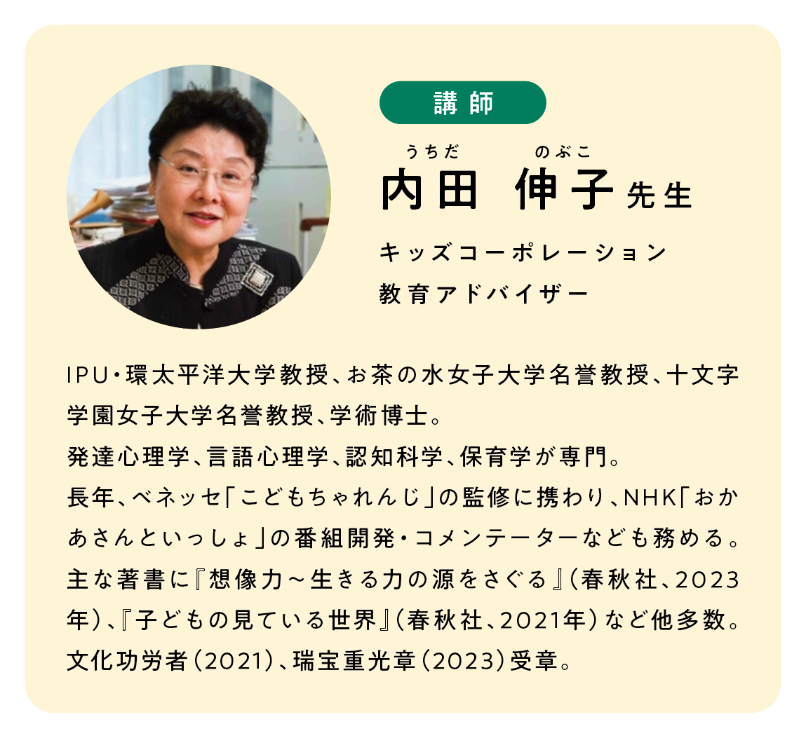 教育アドバイザーには、お茶の水女子大学名誉教授であり、発達心理学・言語発達の第一人者である内田伸子先生を迎えています。