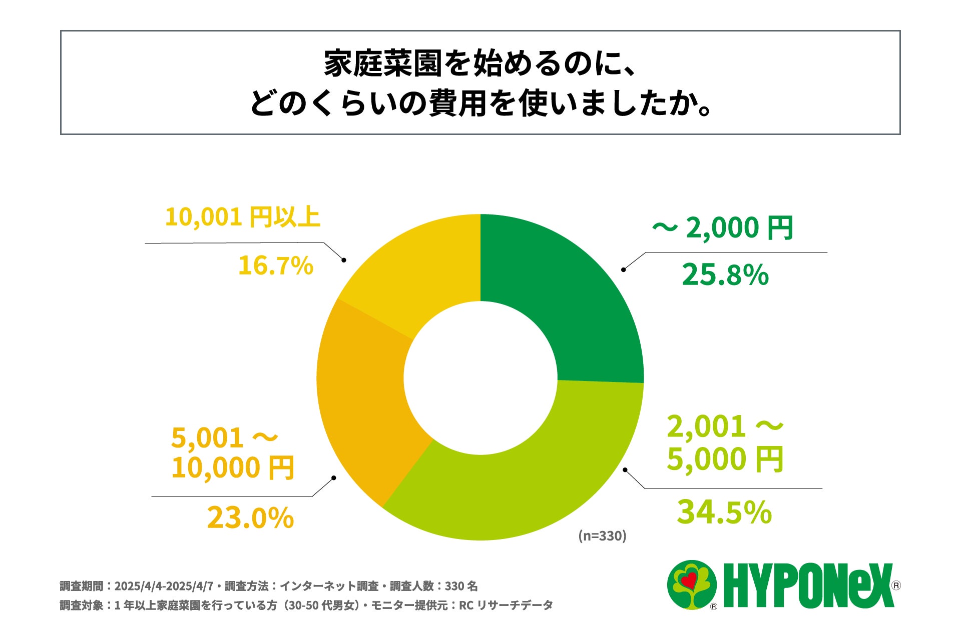 続いて、「家庭菜園を始めるのに、どのくらいの費用を使ったか」を尋ねる設問への回答では、1位が「2,001~5,000円」で34.5%、2位が「~2,000円」で25.8%、3位が「5,001~10,000円」で23.0%という結果になりました。1位と2位の回答を合計すると回答率60%を超える形となり、家庭菜園を始めるのに使った費用が5,000円以下の人が6割以上であることが判明しました。