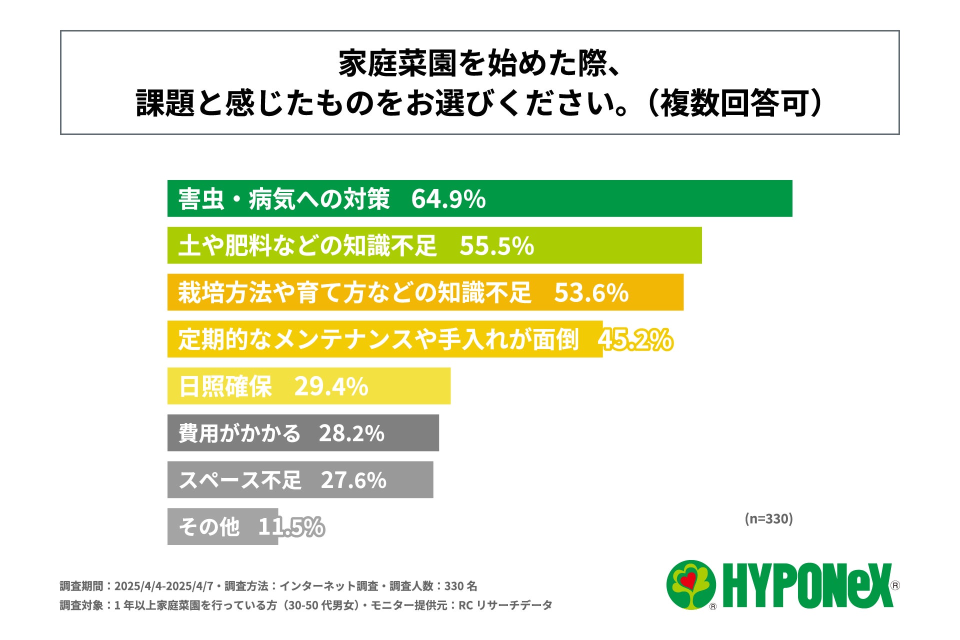 家庭菜園を始めた際、課題と感じたもののトップ3は、1位「害虫・病気への対策」、2位「土や肥料などの知識不足」、3位「栽培方法や育て方などの知識不足」