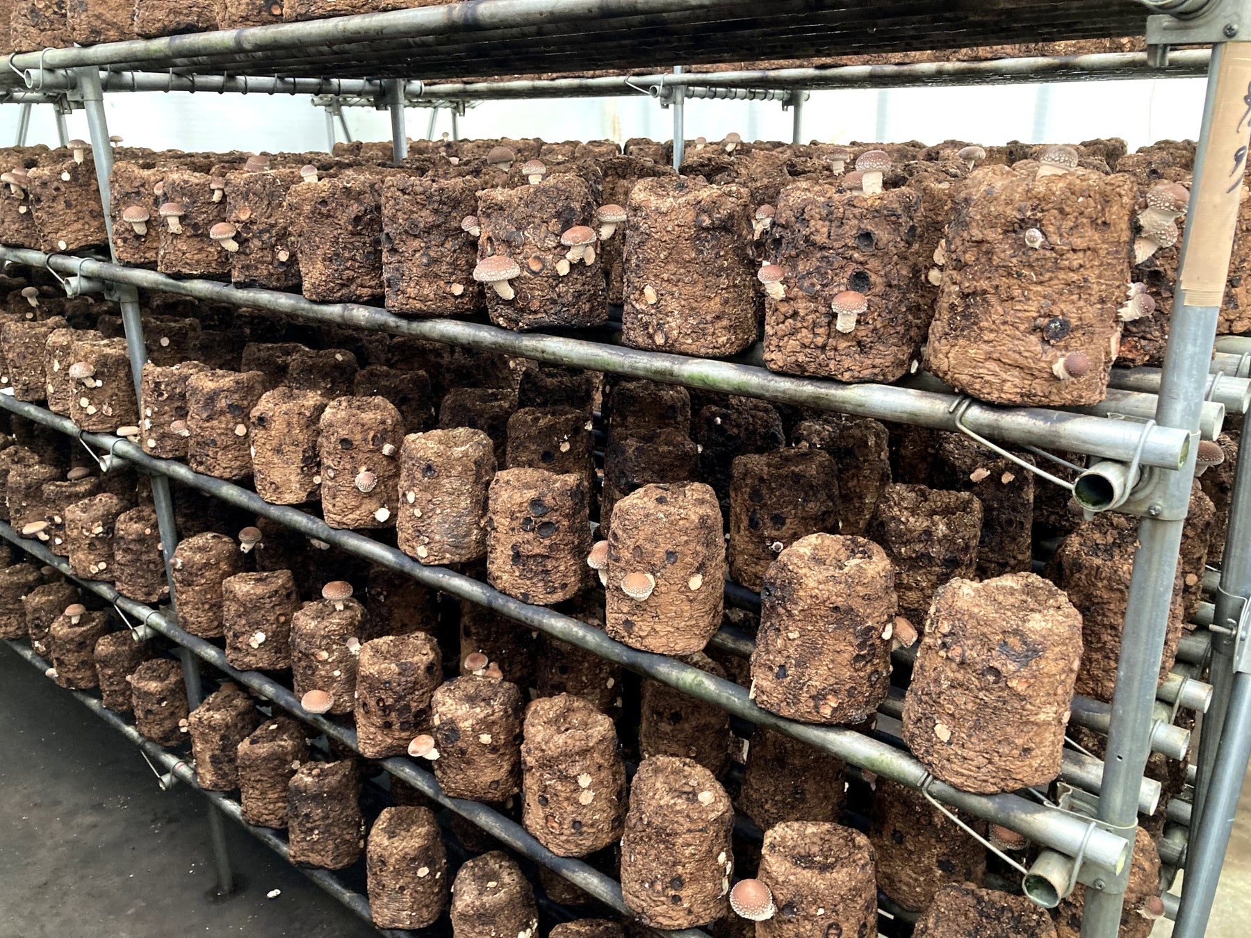 北海道ではシイタケの生産量が全国3位(R4年)で、栽培方法は原木栽培がわずか2%であ るのに対し、菌床栽培が98%を占めます※。菌床栽培とは、オガコに米ぬかなどの栄養源を加えて固めたもの(=培地)に種菌を接種し、3ヶ月ほど空調設備などを備えた施設内においてキノコを発生させる方法です。