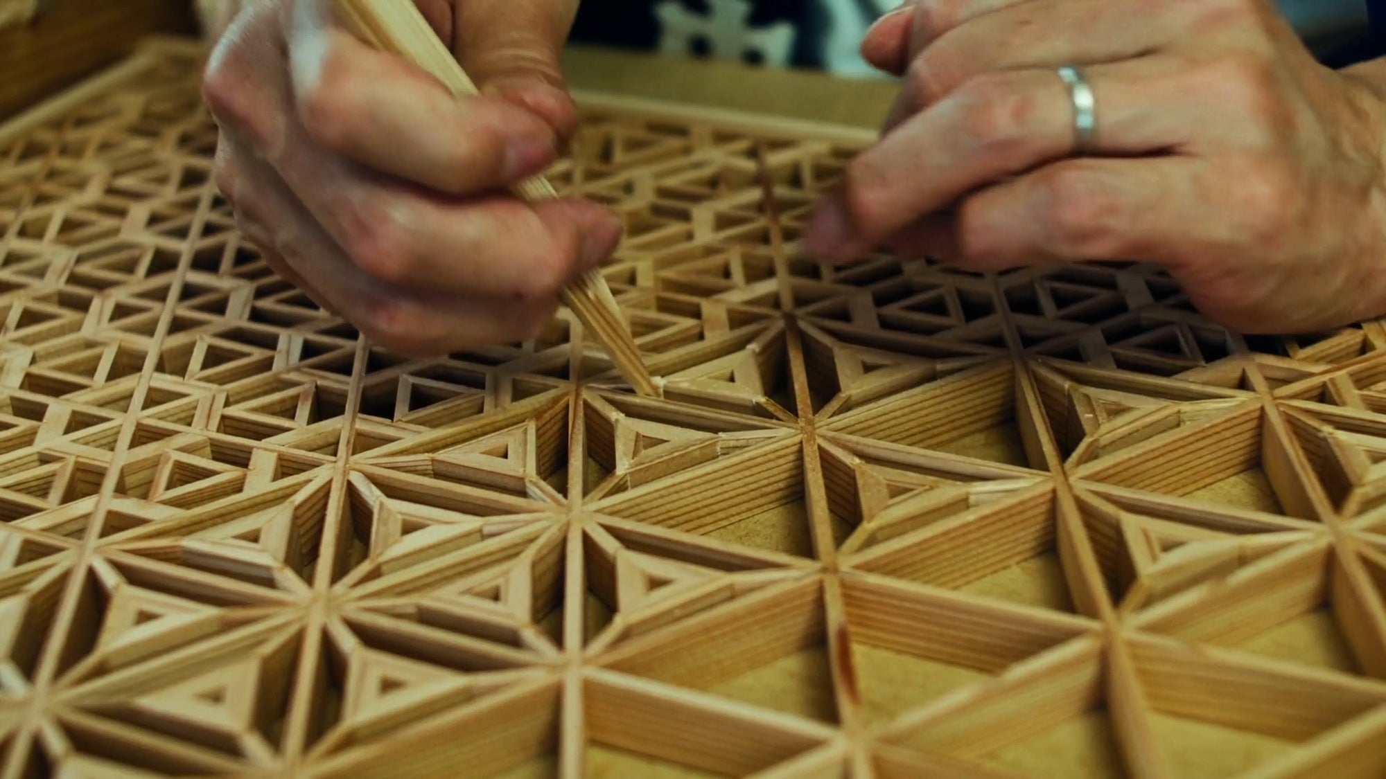 1982年江戸川区にて創業。「組子細工」の端緒は、平安時代に生まれた日本建築の建具であり、釘を一切使うことなく、小さな木片を手作業で組み合わせてさまざまな模様を編み出すことができる。
