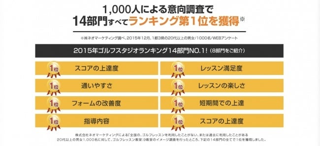 「5ラウンド以内にスコア100が切れなければ全額返金」というユニークなサービスを展開しており、1,000人による意向調査で、ゴルフスタジオランキング14部門でNo.1に輝いた(※)ゴルフレッスンスクールです。