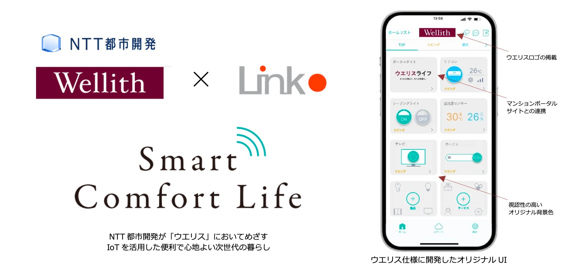 今回、NTT都市開発はリンクジャパンと連携し、リンクジャパンのHomeLinkアプリをベースに、ウエリス仕様のオリジナルUIを開発。マンションポータルサイトとの連携はもとより、ワンアプリ化により、住まいのあらゆる機能をスマホひとつでコントロールでき、さらに医療連携等ソフトサービスの機能追加にも対応する、便利で心地よい次世代の暮らし『Smart Comfort Life』を提供します。